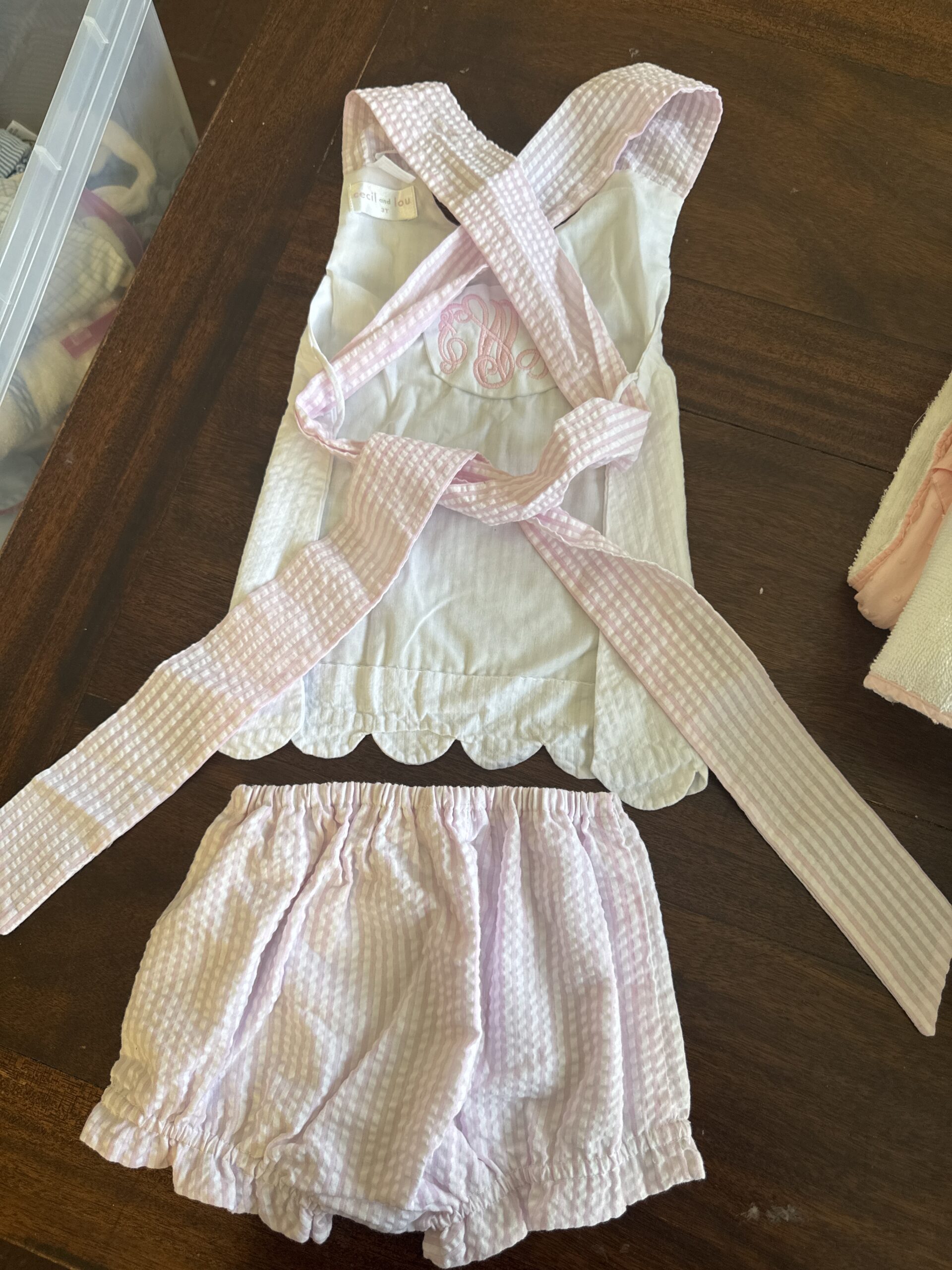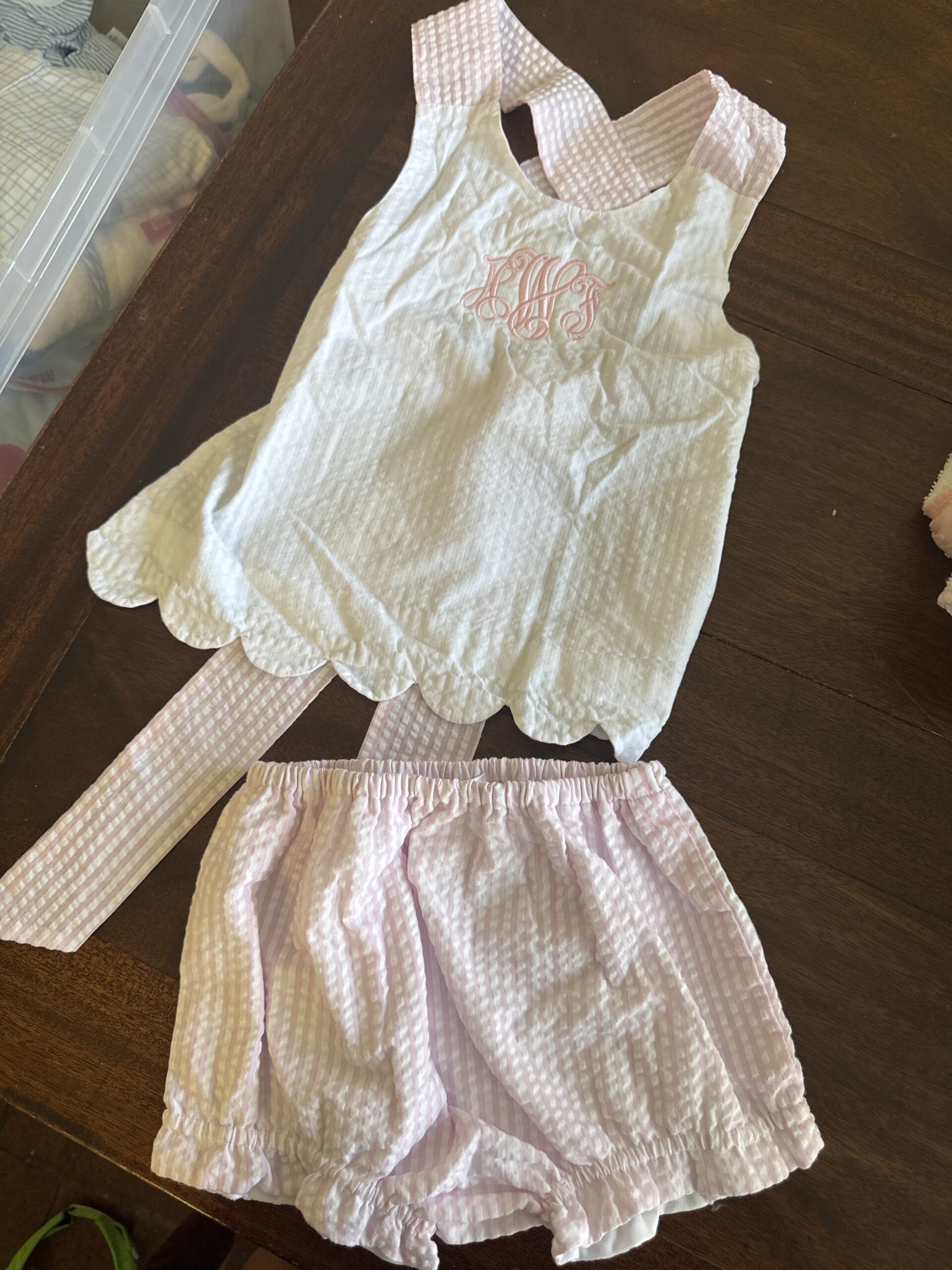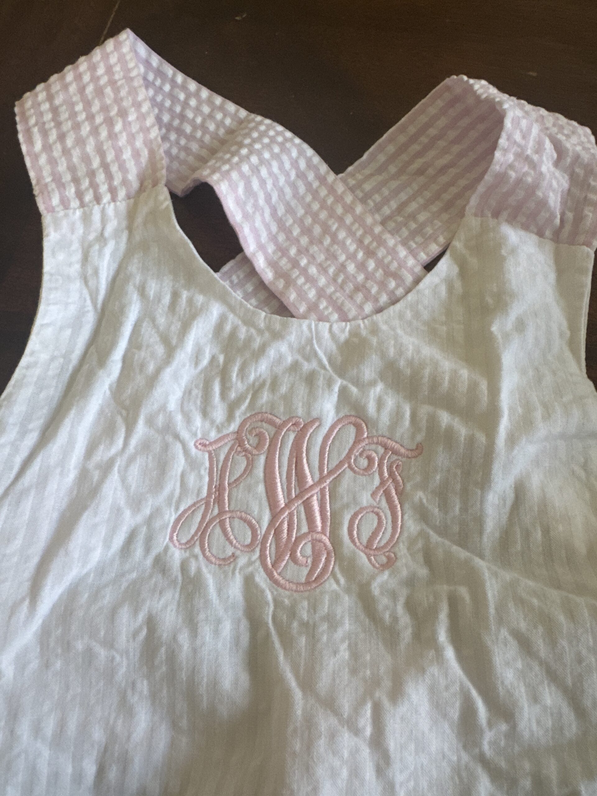White and pink seersucker criss cross set ties in back. The back doesn’t photograph well not on a body, but it’s precious on and tied! Don’t think we ever wore- once at most!