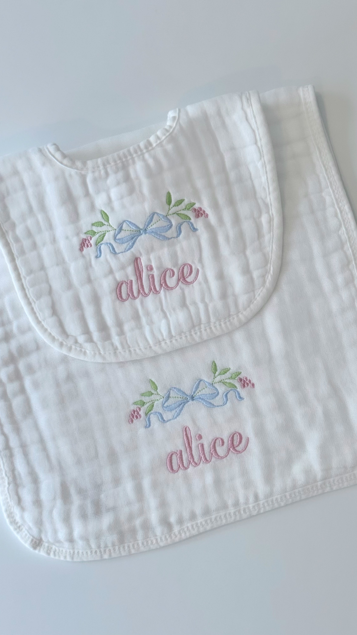 Muslin Bib & Burp Cloth Set. Name: Alice + Bow and Berries