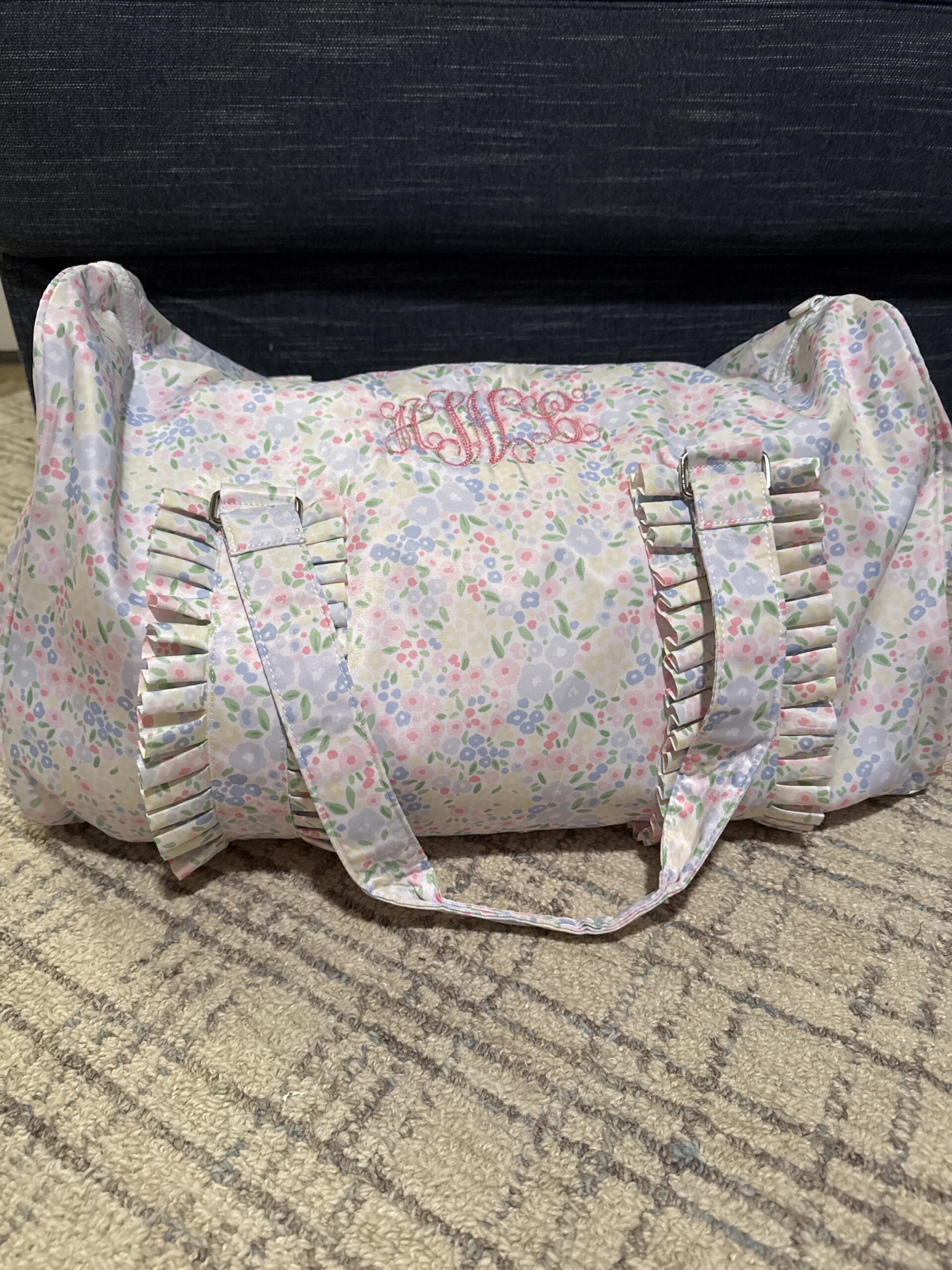 TRVL weekend duffle, floral with ruffle. Retail $66+ no monogram. Long shoulder strap not included.