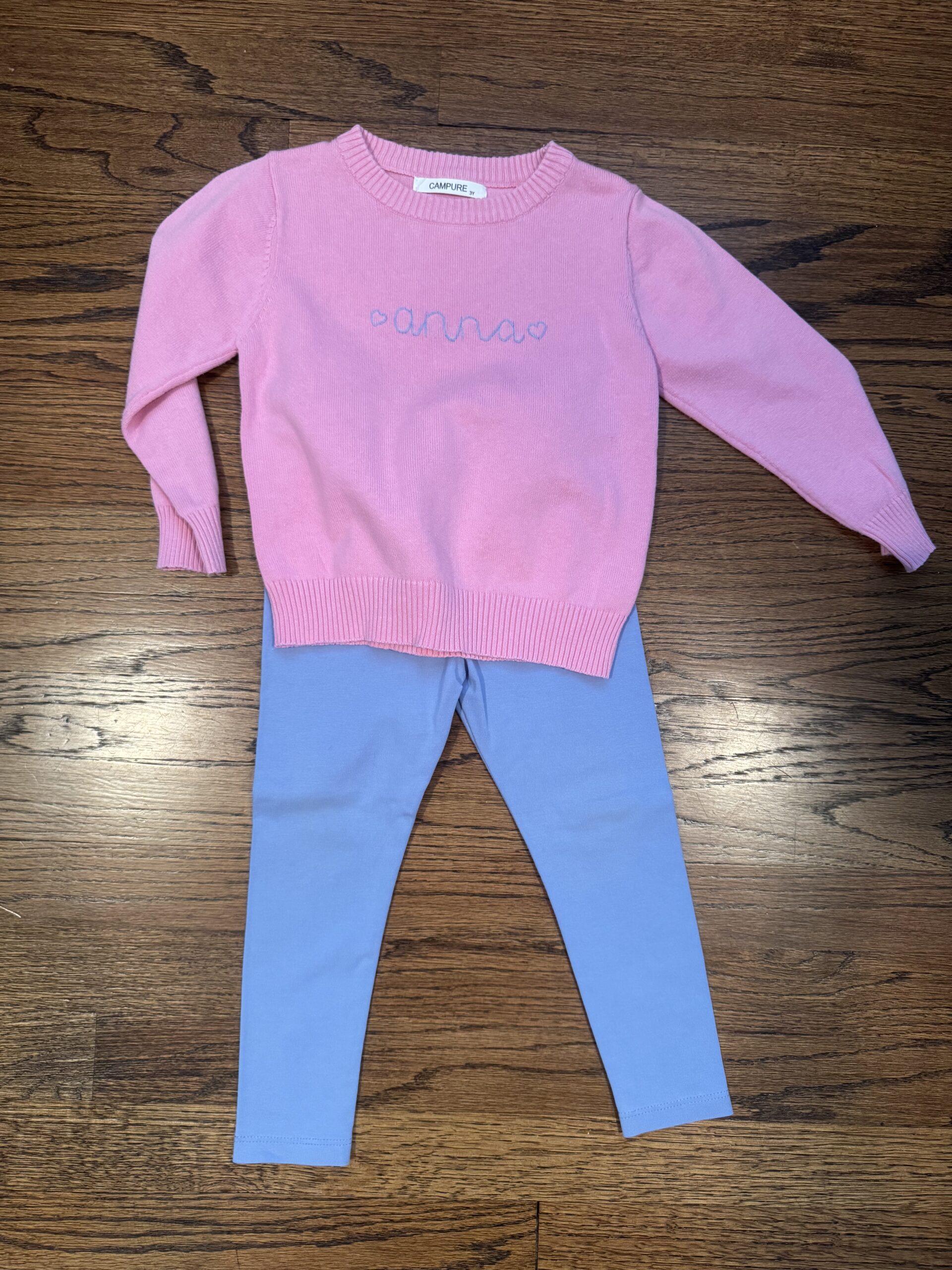 Campure 3T sweater with hand stitched “Anna” and TBBC 2T leggings.  We wore at 2.5 and 3.5.  No blatant stains but I feel like sweaters and solid leggings show wear easily.