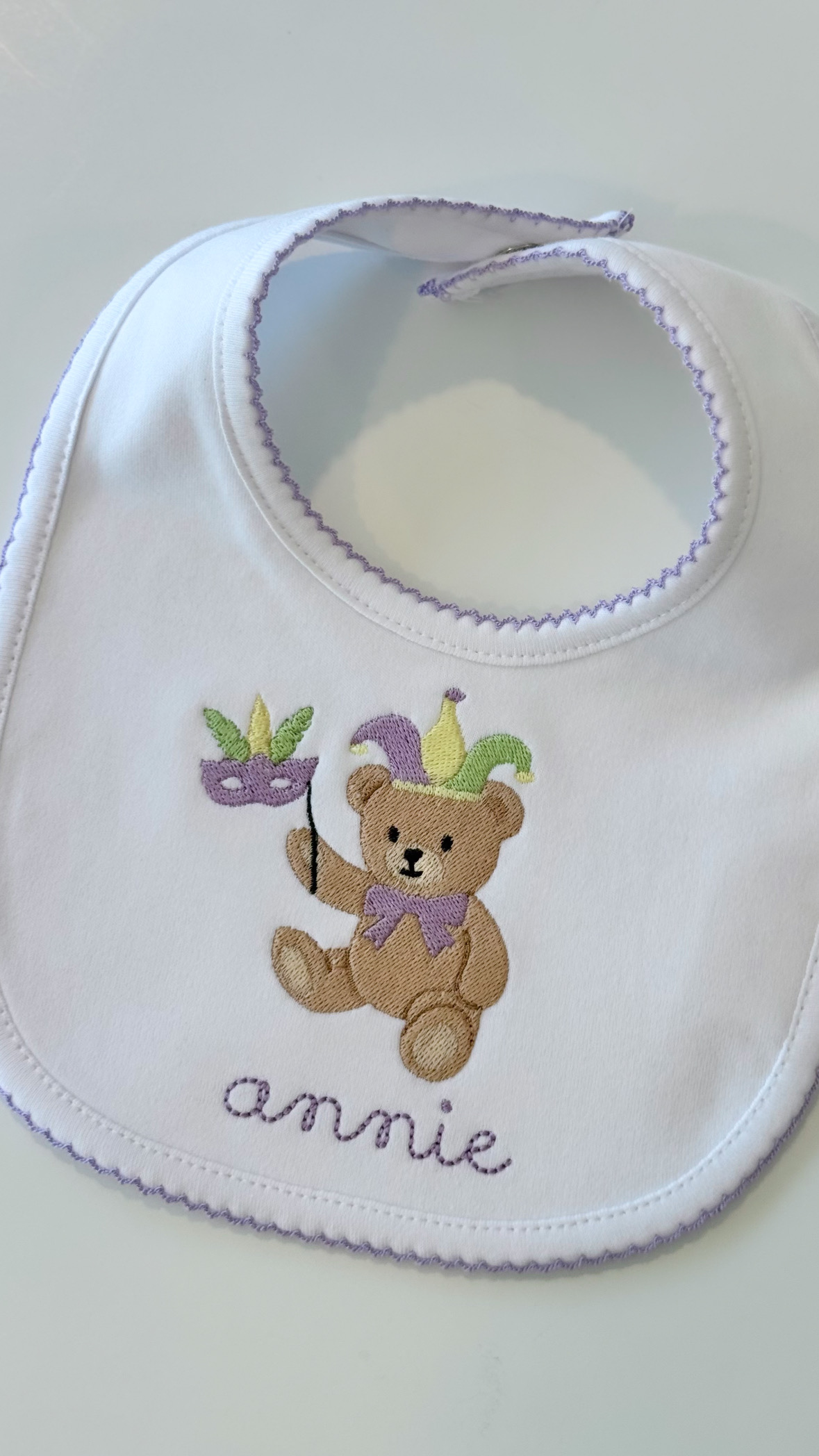 100% Cotton Bib with lavender picot trim. Name: Annie + Mardi Gras Teddy Bear