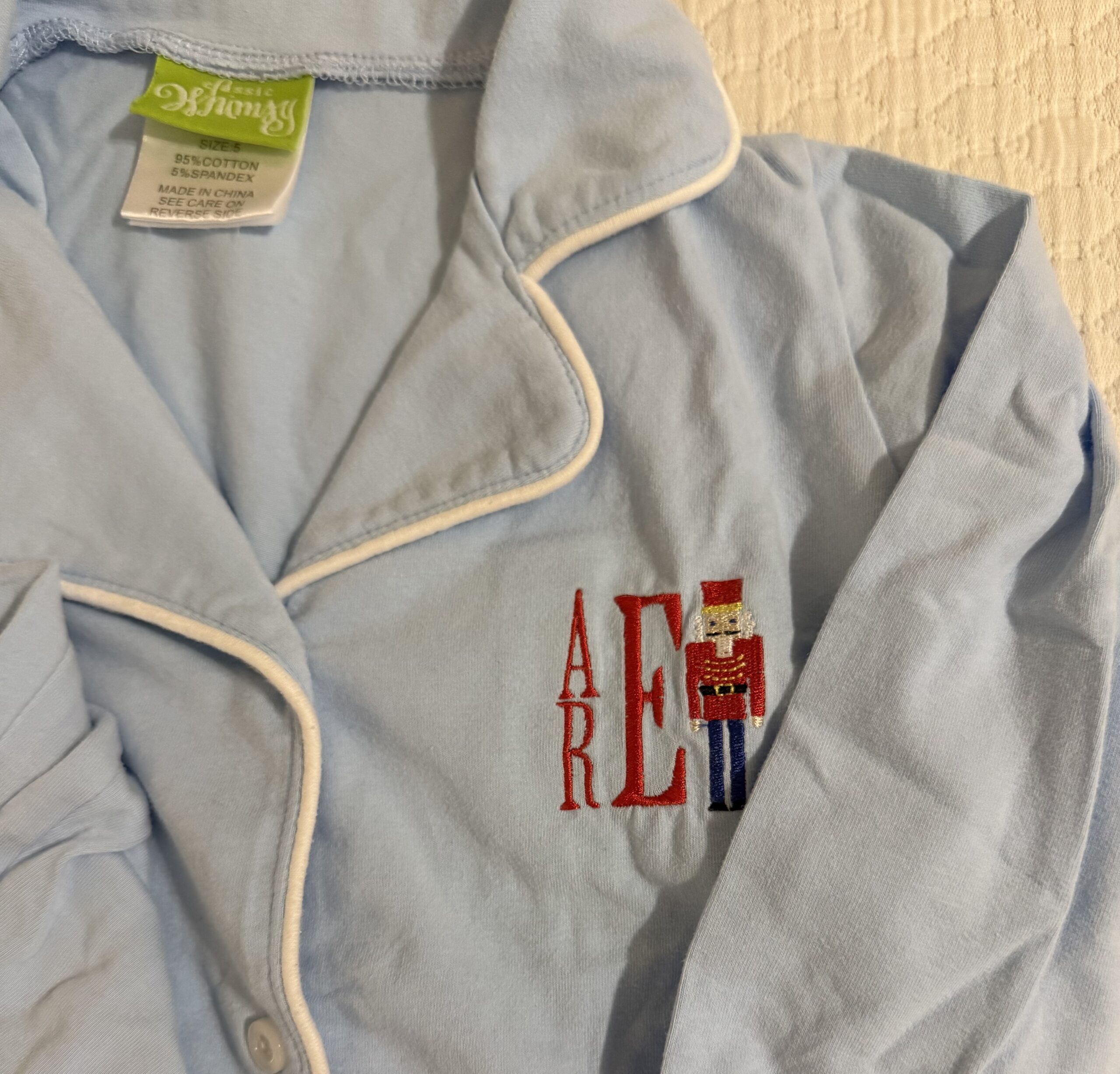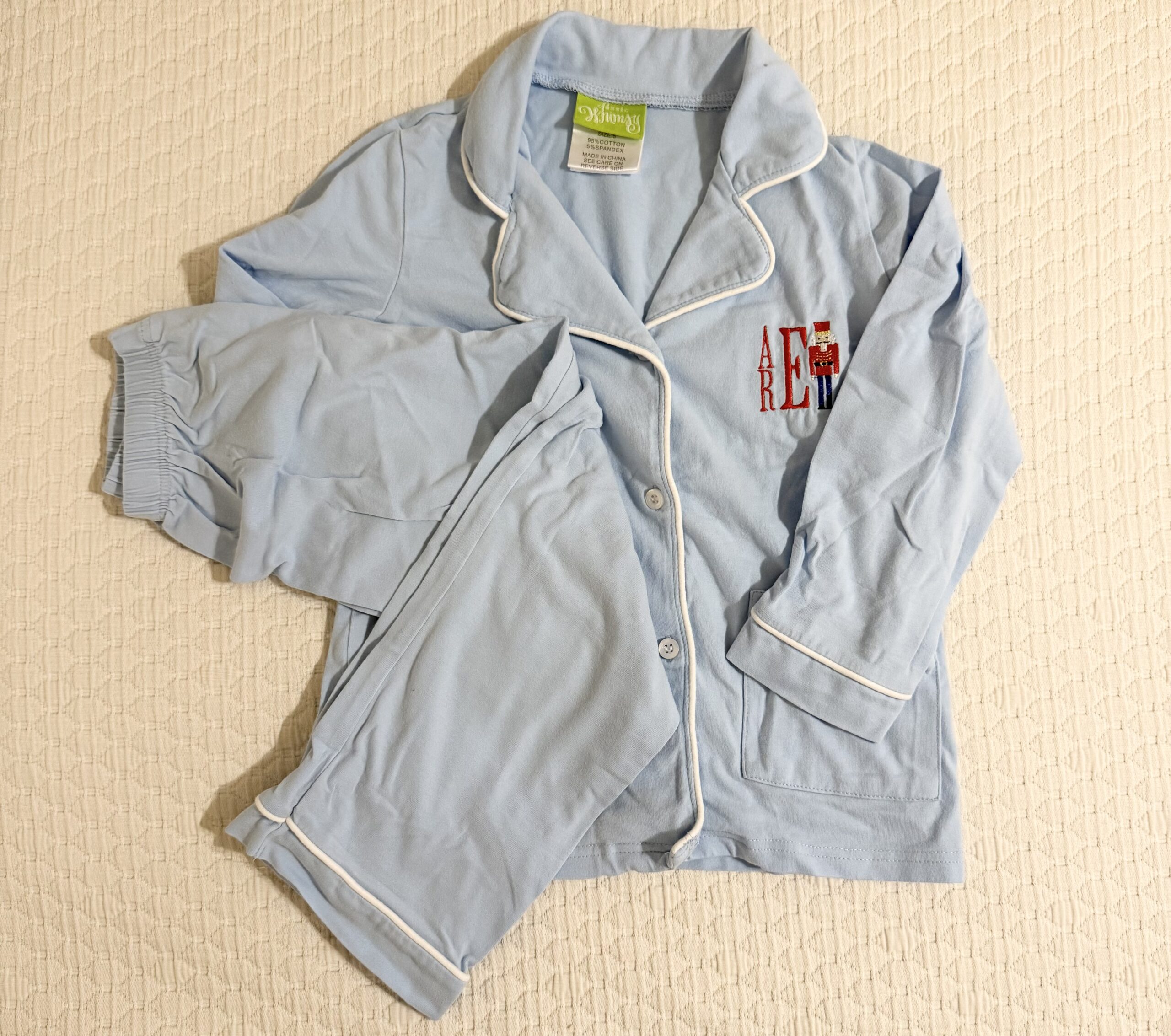 Long pants and long sleeve button-up top pajama set, light blue with white piping, red monogram with Christmas nutcracker; 95% cotton, 5% spandex