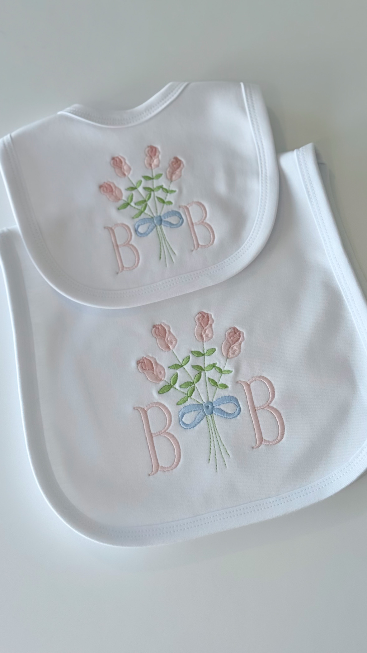 100% Cotton White Plain Trimmed Bib & Burp Cloth Set. Monogram: BB + Bouquet