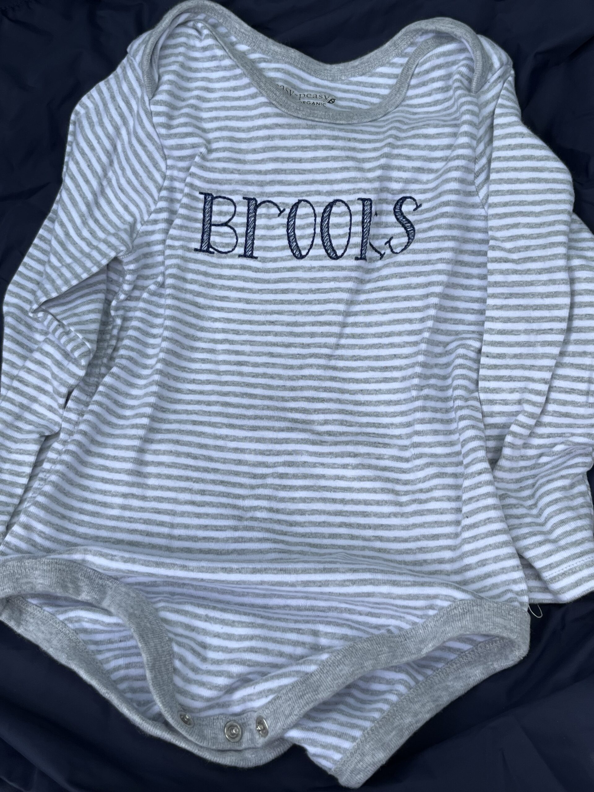Gray striped Brooks onesie. Brand is easy peasy. Sizing is generous.