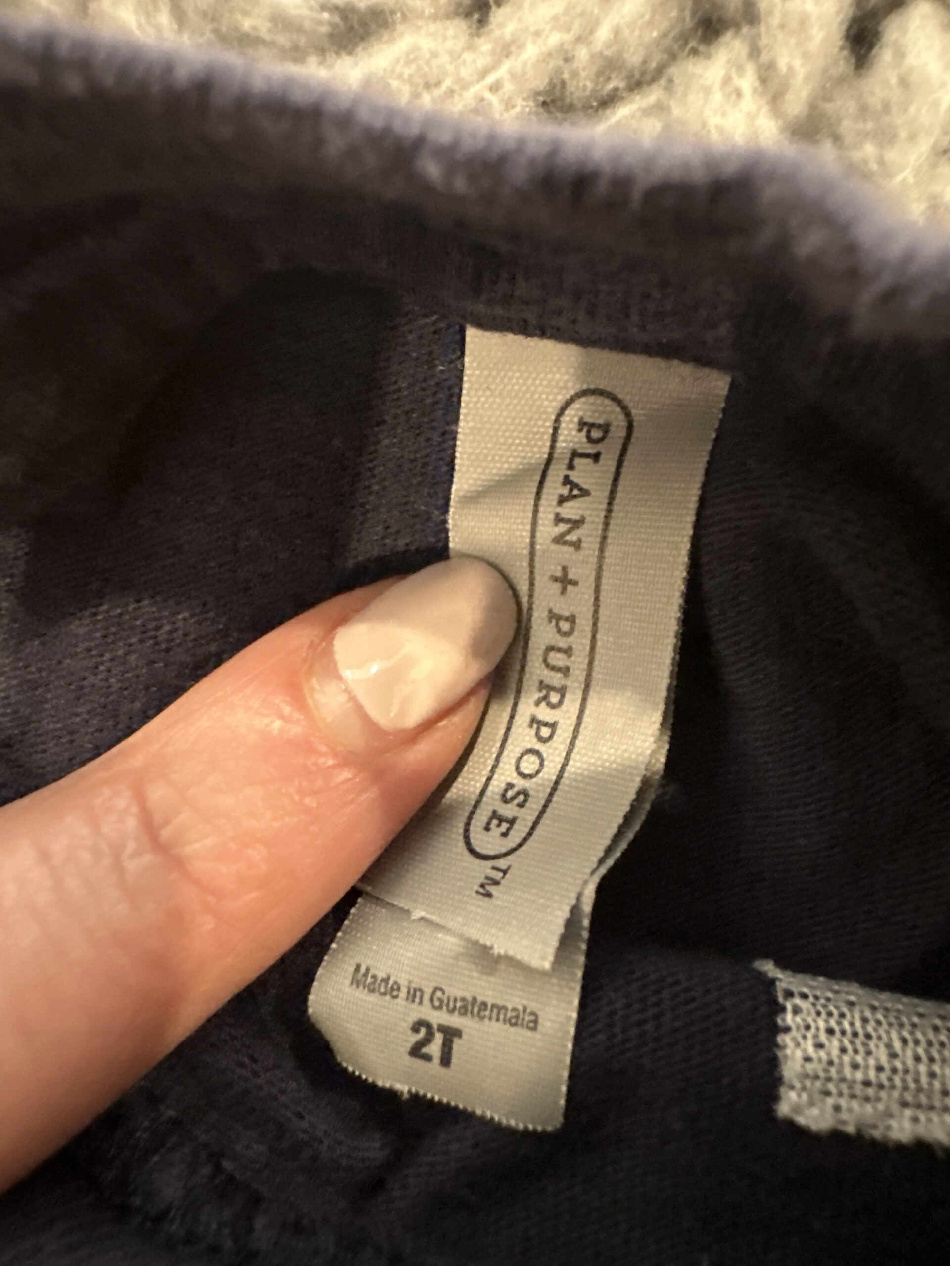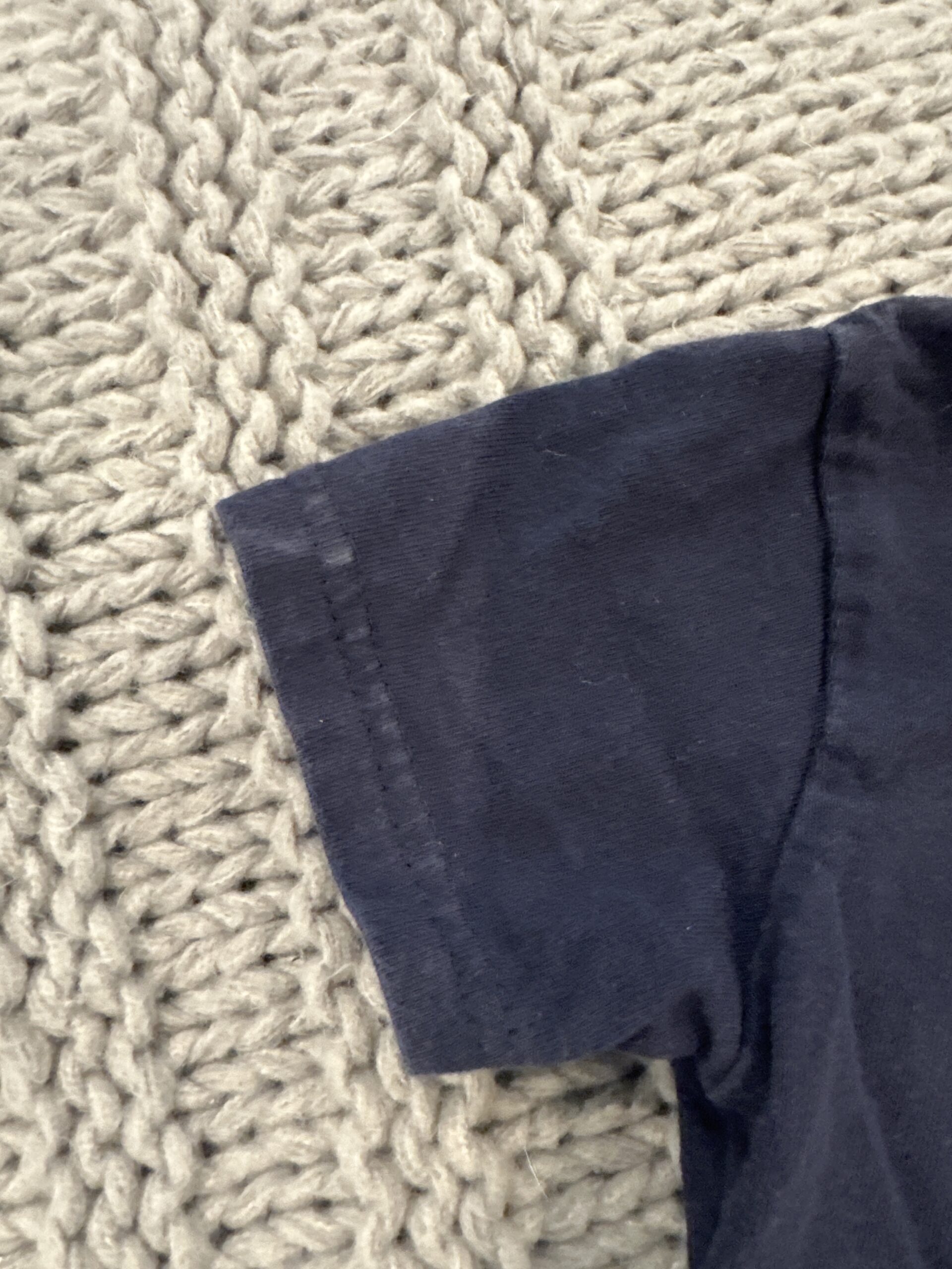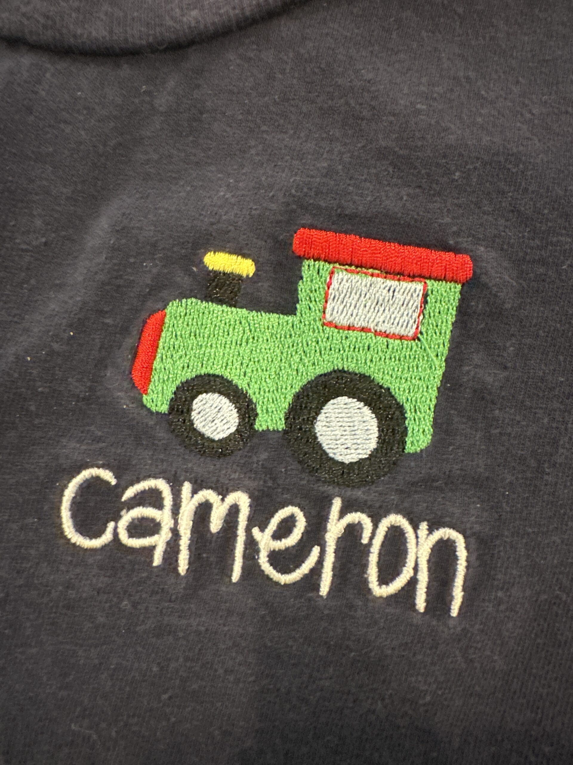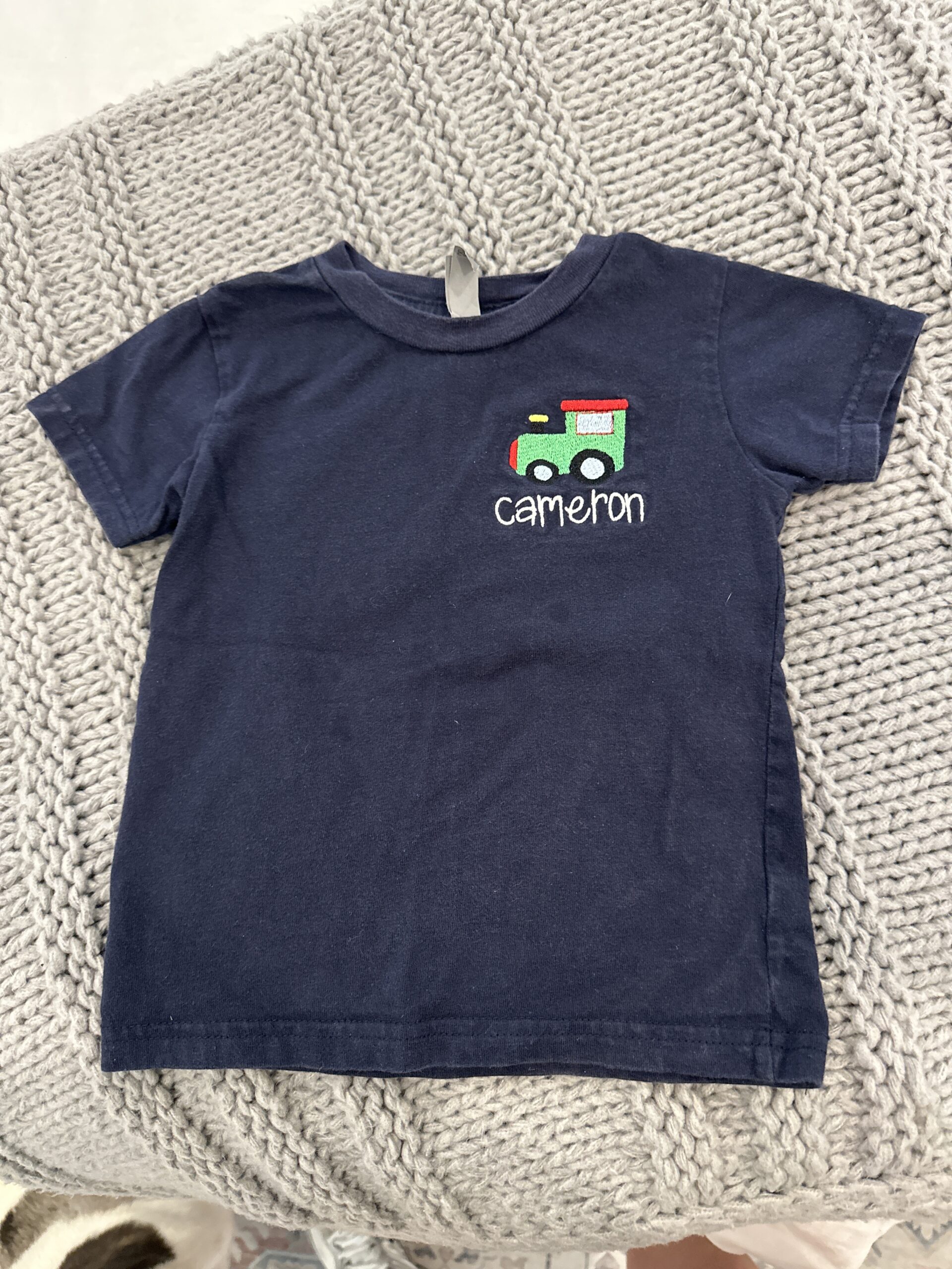 Navy blue size 2T boys toddler shirt, white monogramming with a train. small discoloration on sleeve as shown in photo but hard to notice.