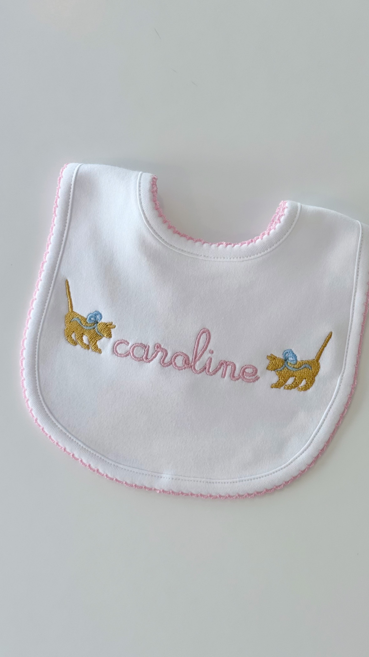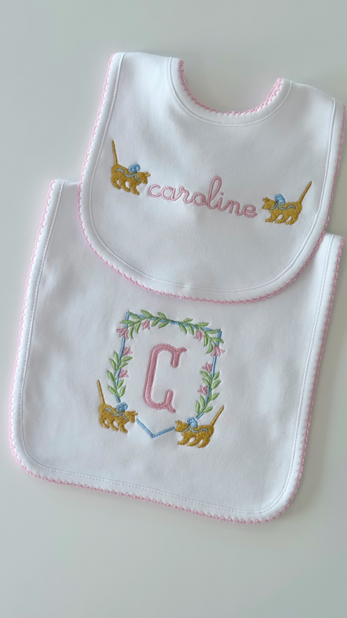 100% Cotton Bib and Burp Cloth Set with Pink Picot Trim. Name: Caroline + Kittens