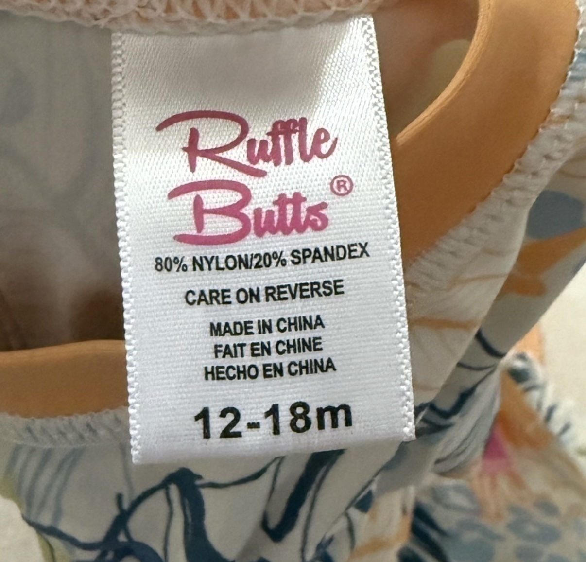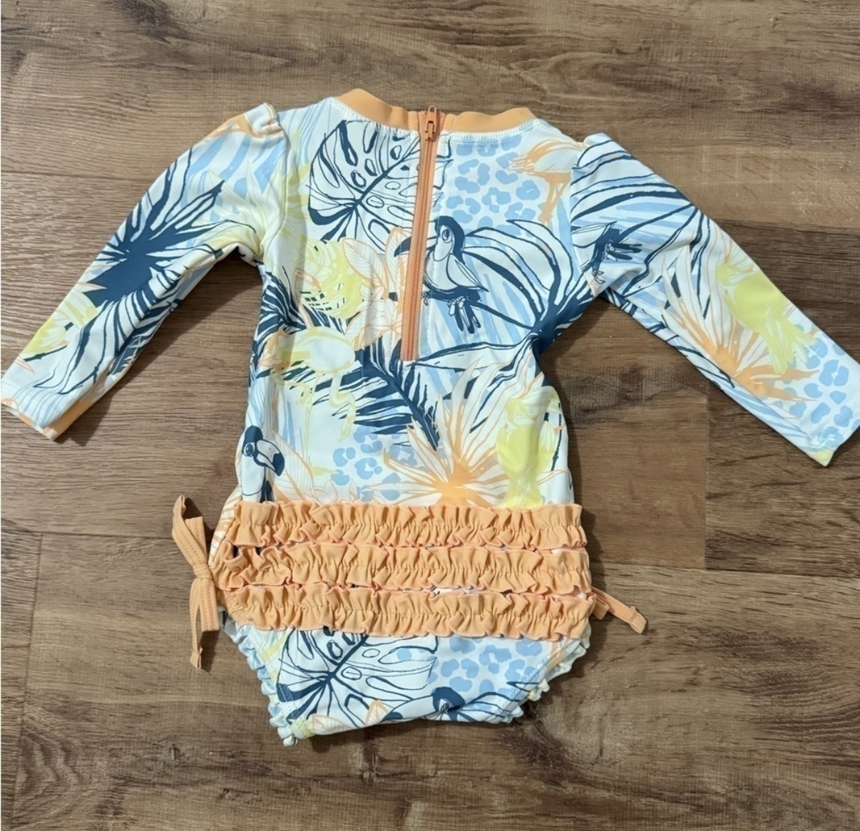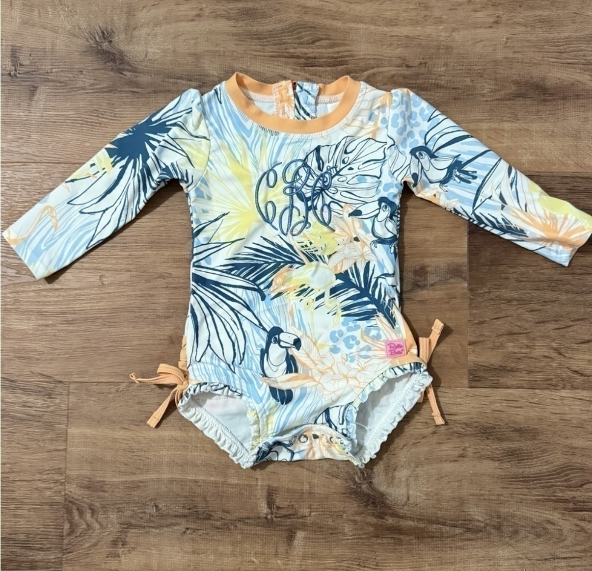 Little girls 12-18 month RuffleButts swimsuit monogrammed with “cBc” on front. Features fun tropical print.