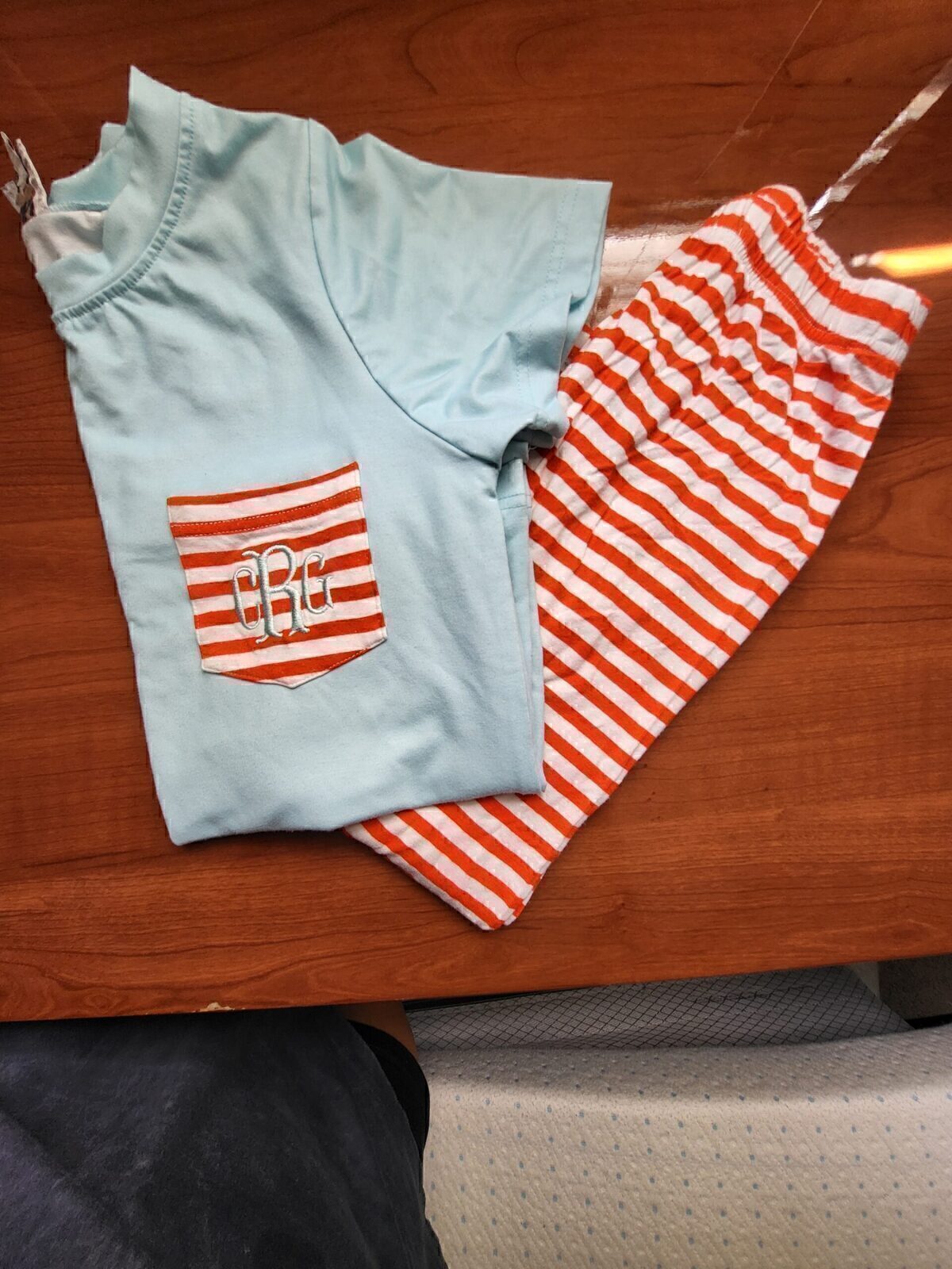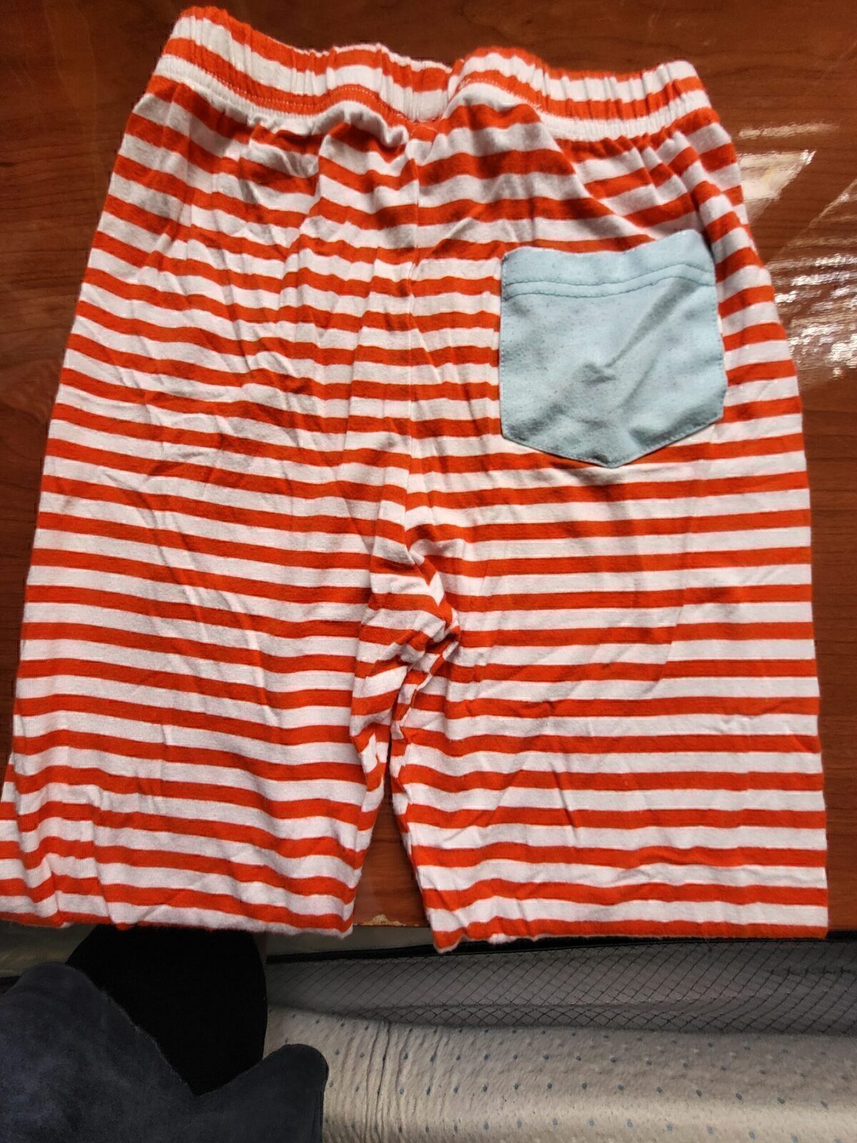 PJ set. Stripes are orange. No spots or wear and tear. Pocket on the back of pants.