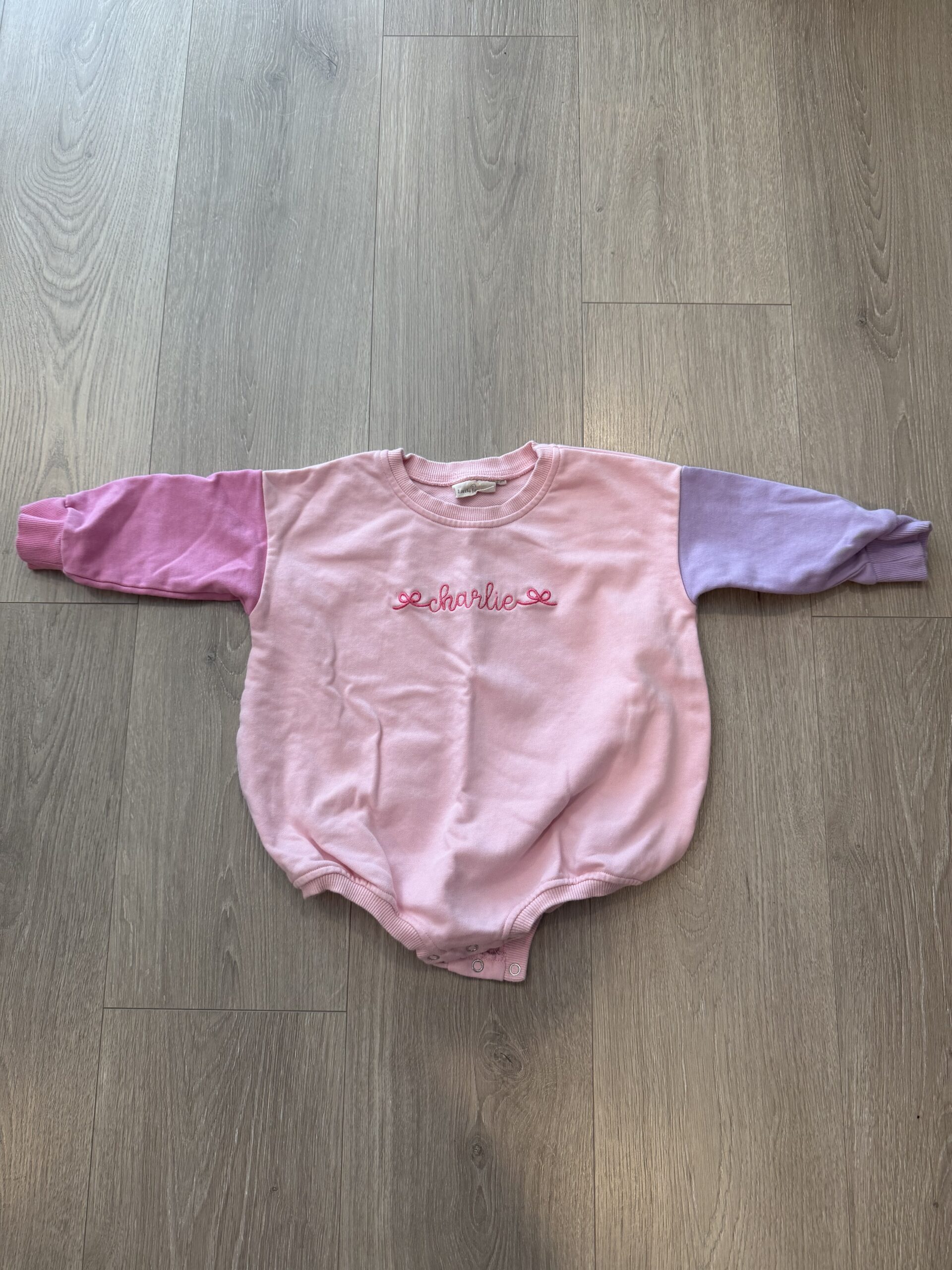Little Joy Co pink & purple color block bubble with hot pink Charlie bow monogram