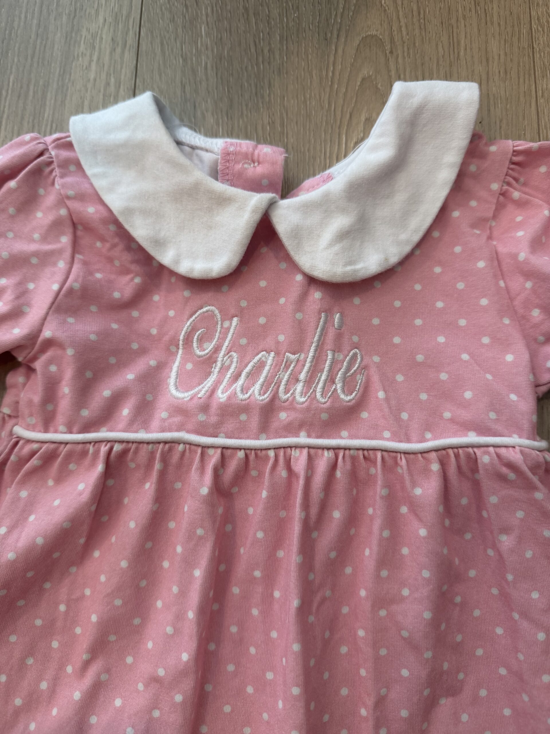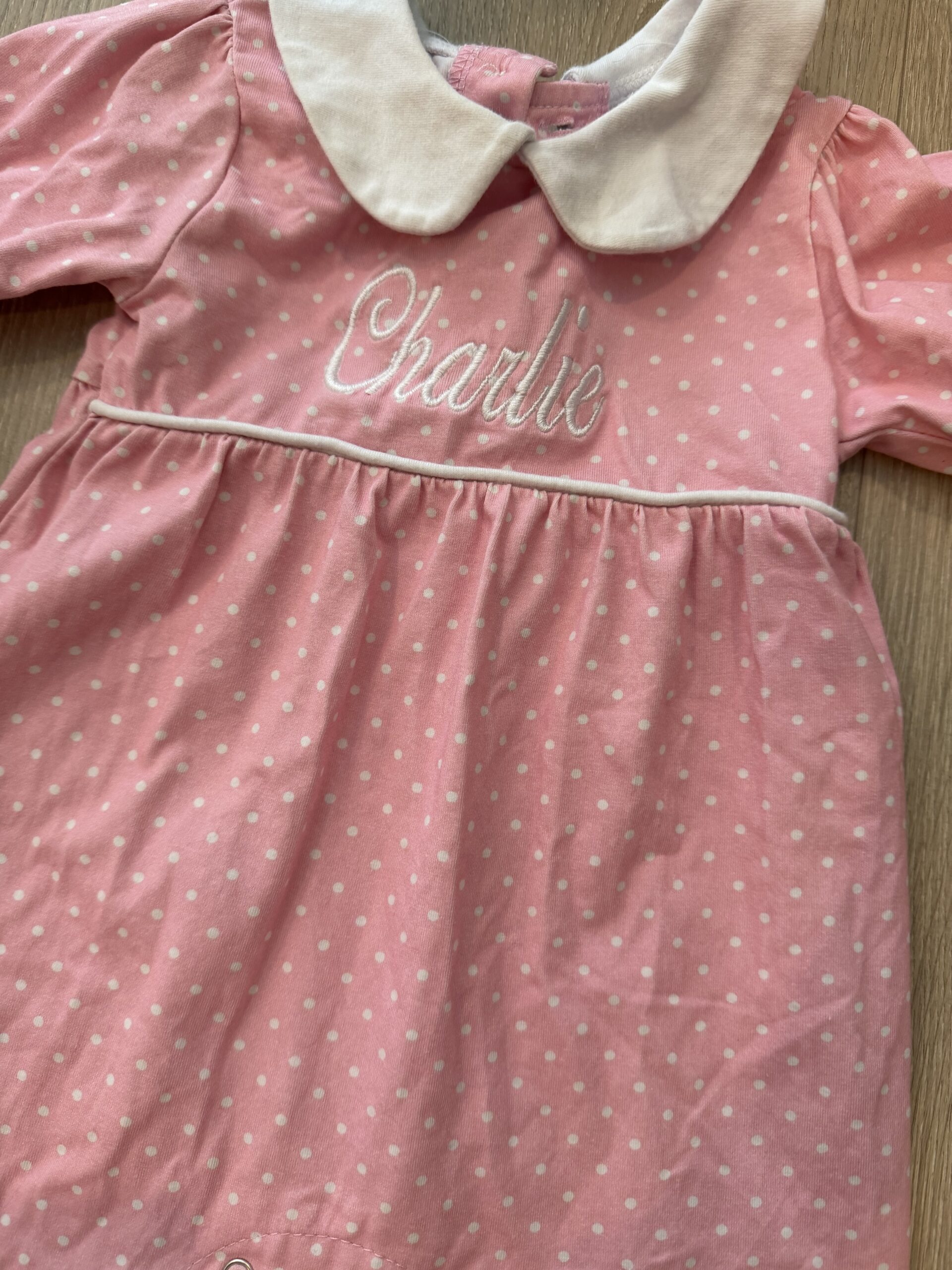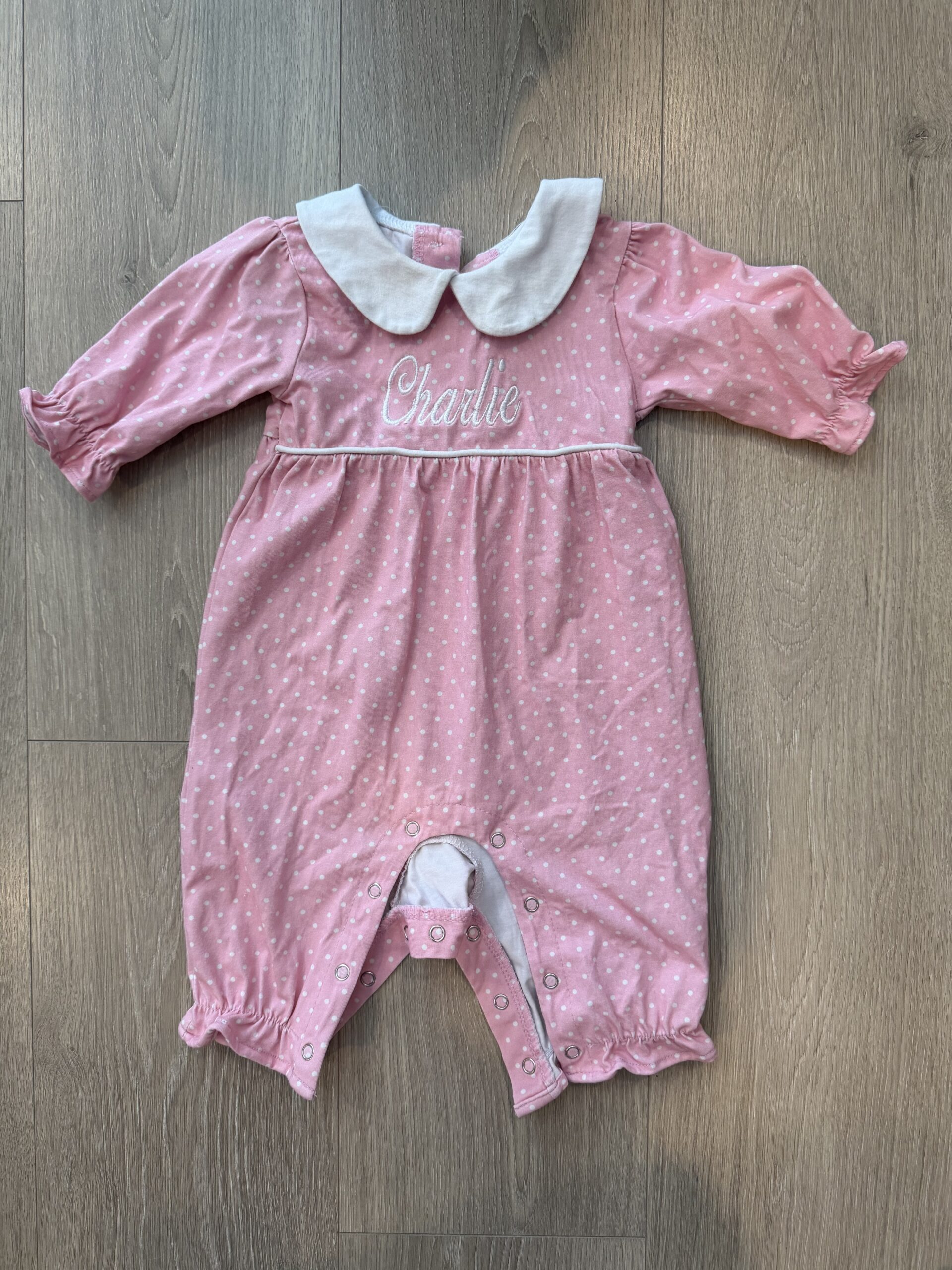 Pink & white polka dot onesie with white Charlie monogram. A little wear on the collar, can be treated. Otherwise excellent condition.