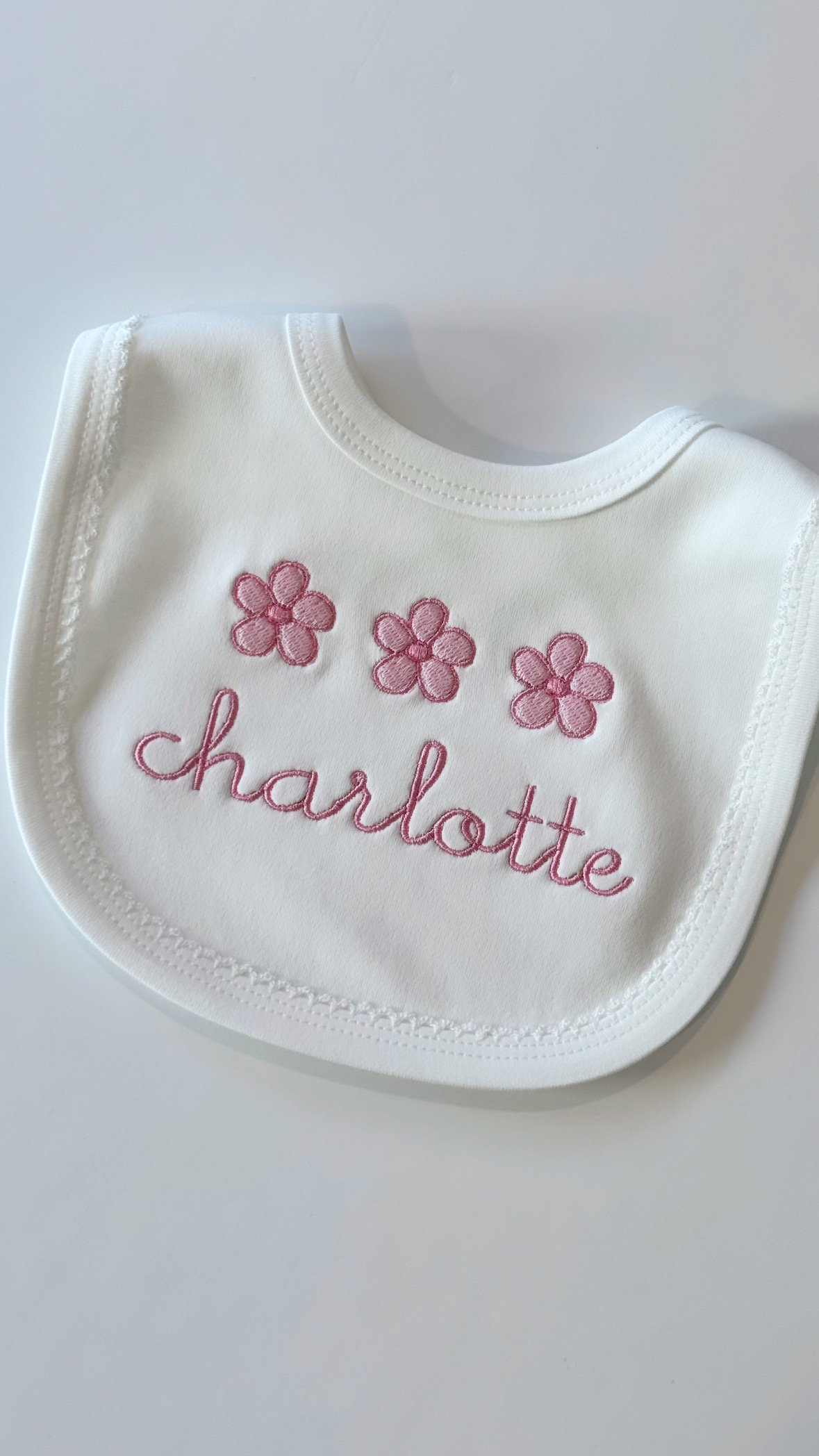 100% Cotton Bib Organic White with White Picot Trim. Name: charlotte