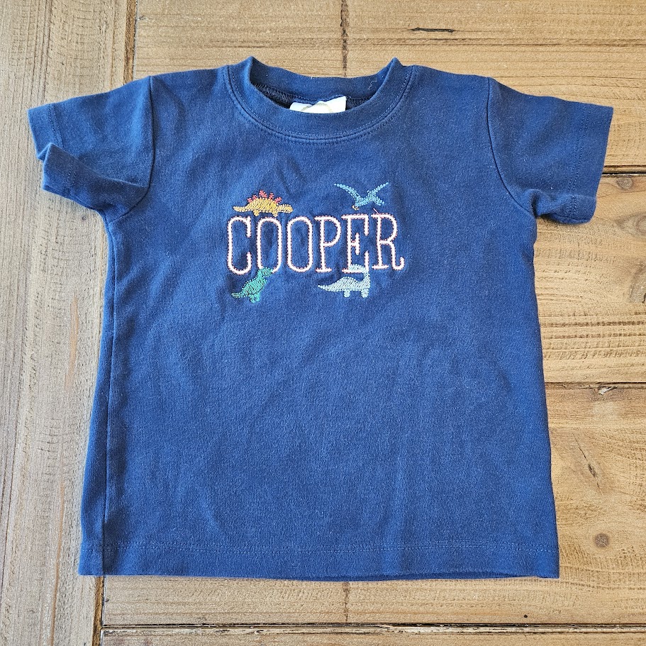 Dinosaur embroidered shirt. Slight wash wear as typical with navy.