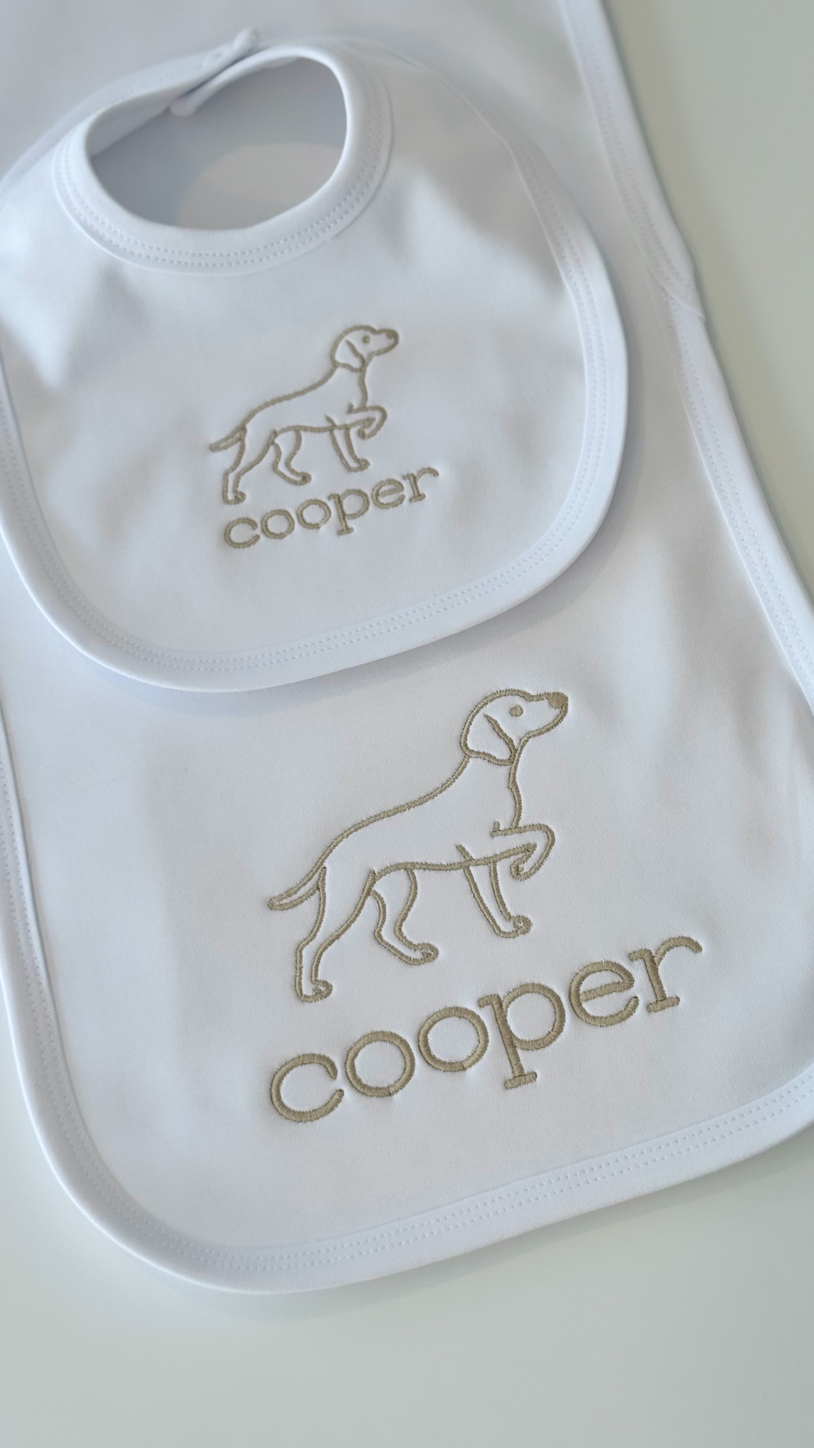 100% Cotton White Plain Trimmed Bib & Burp Cloth Set. Monogram: Cooper + Dog