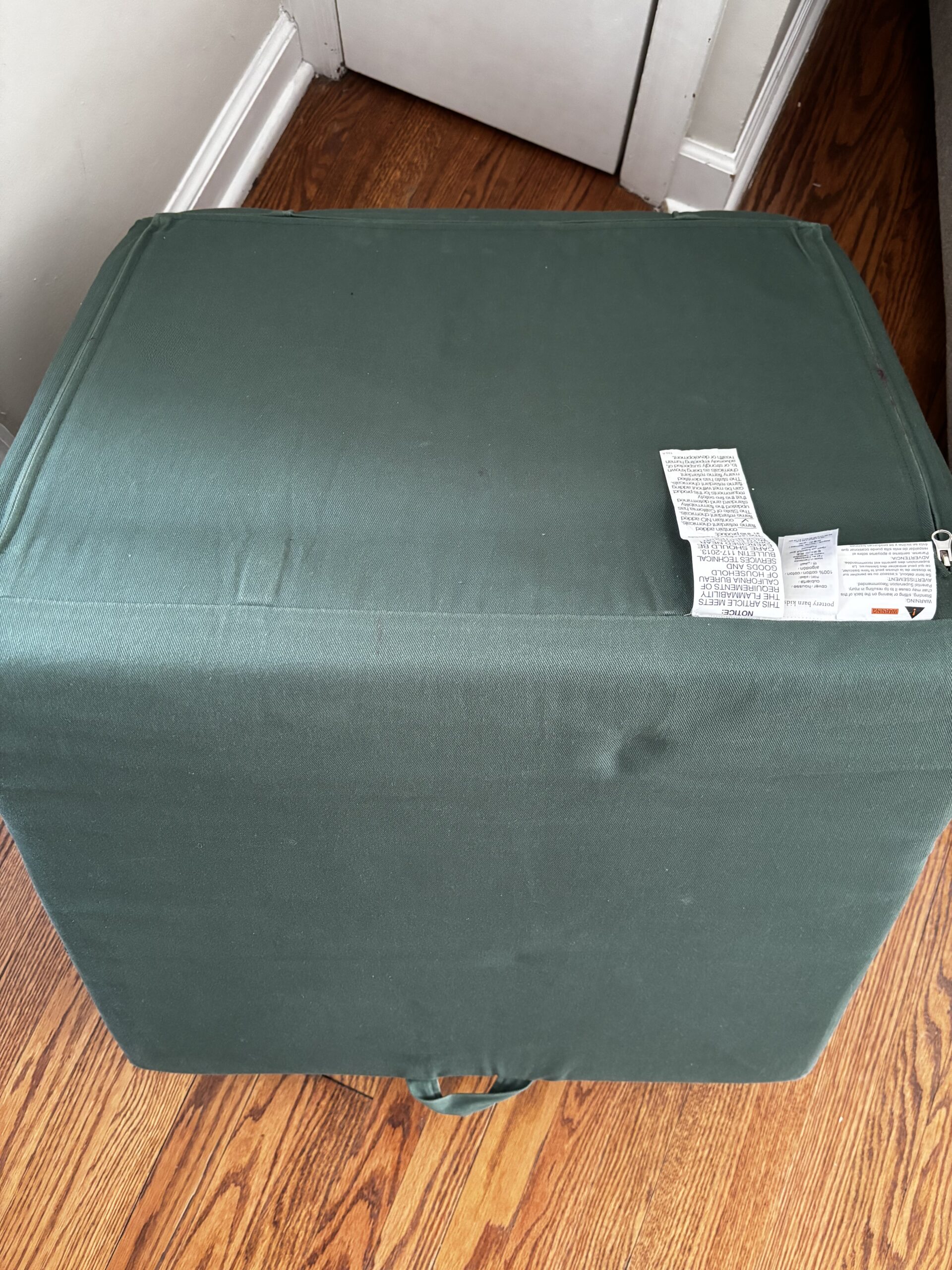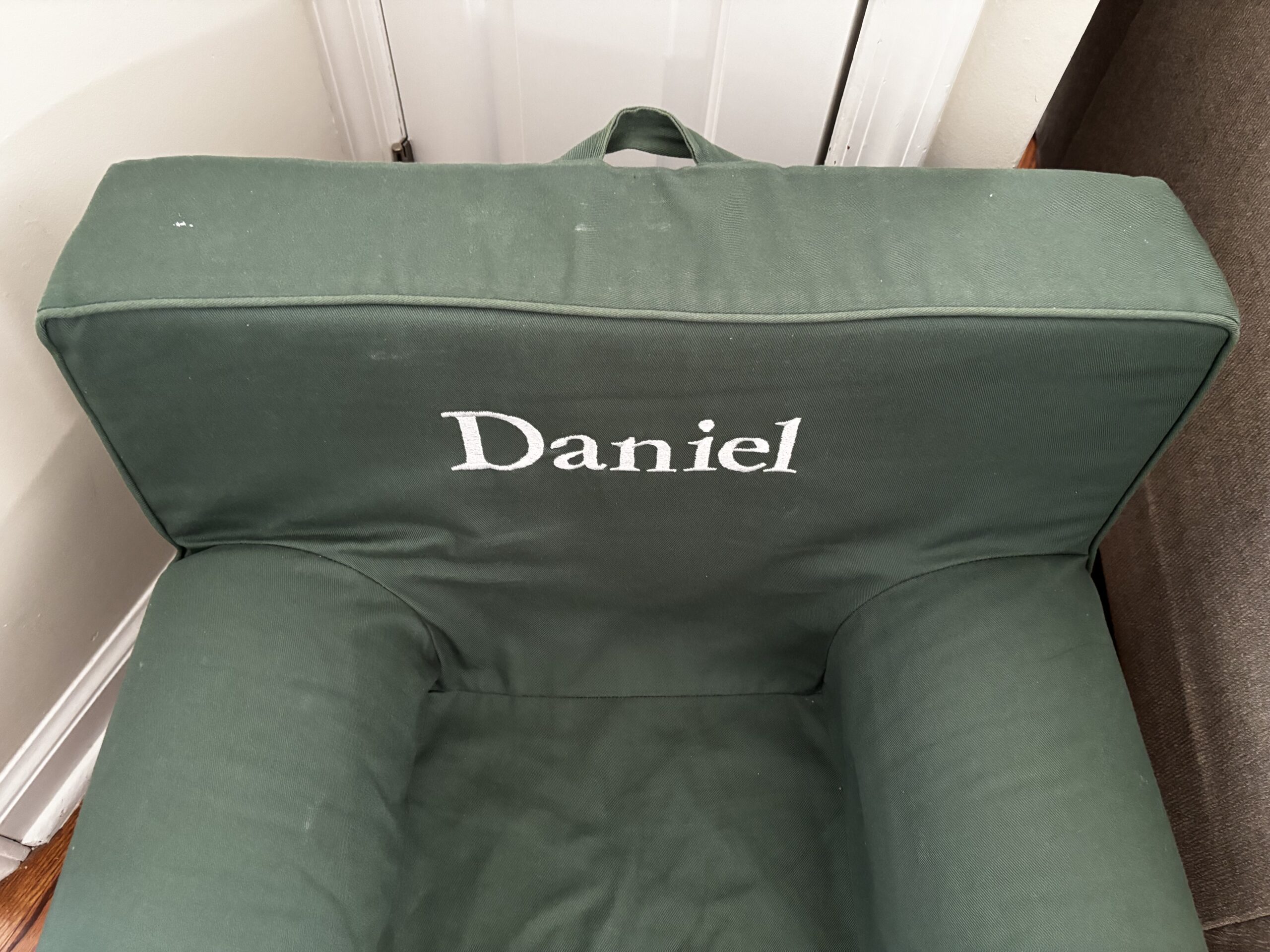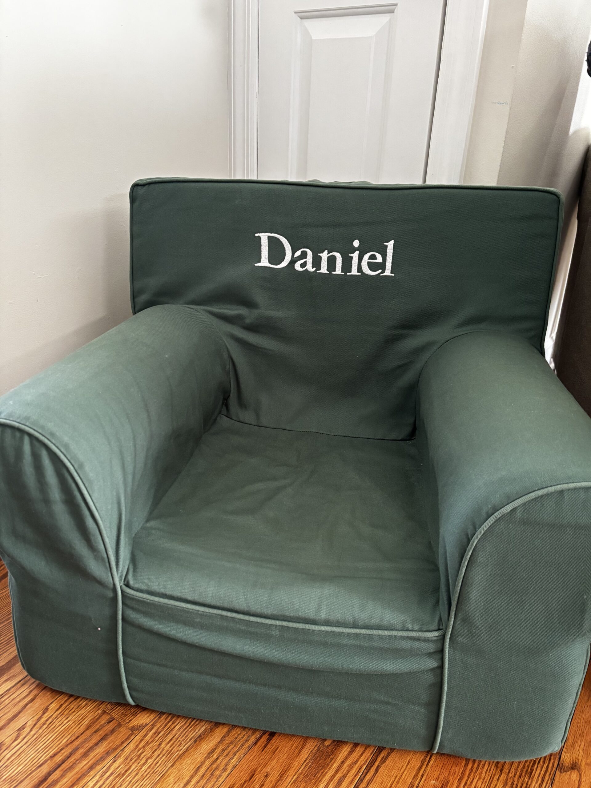 Excellent, used condition Anywhere Chair from Pottery Barn Kids. Forest green with white stitching. Coming from a smoke-free and pet-free home. Includes slipcover only.