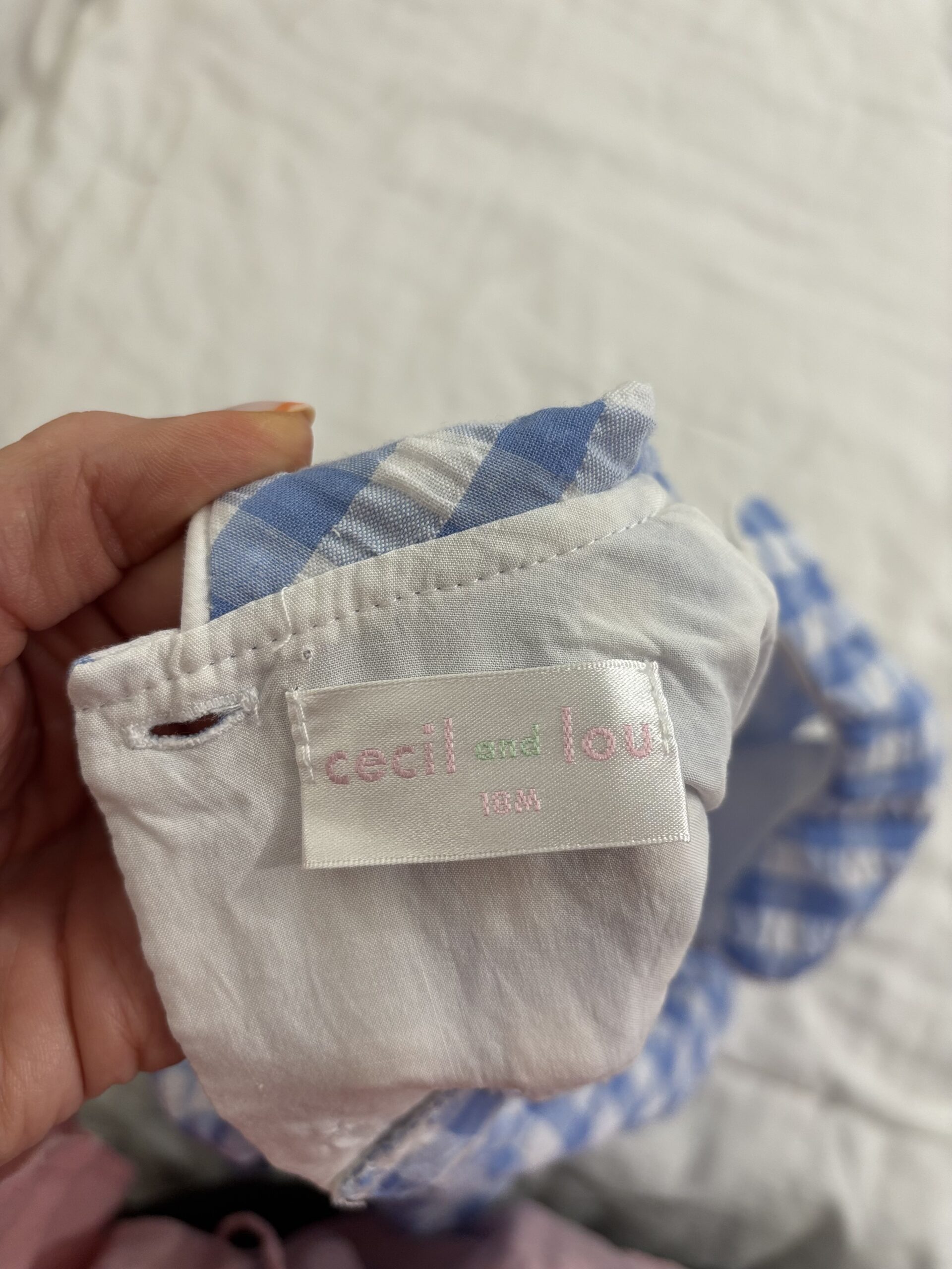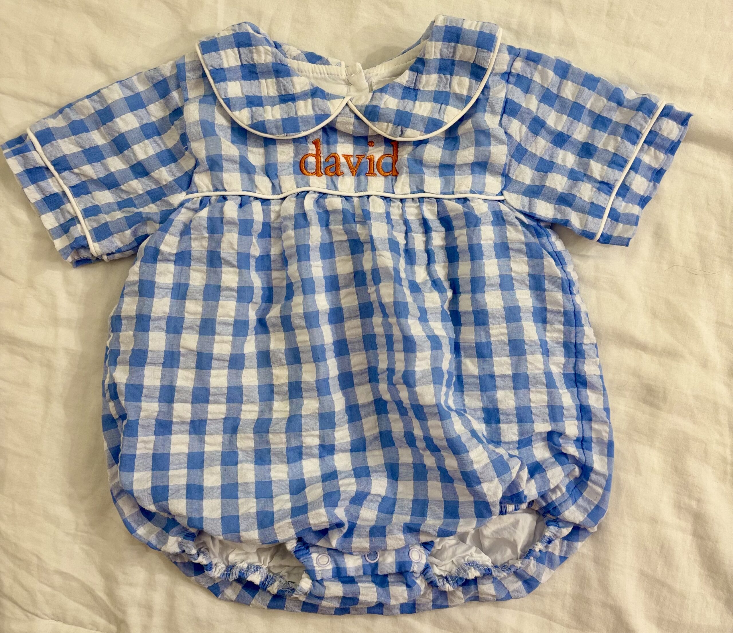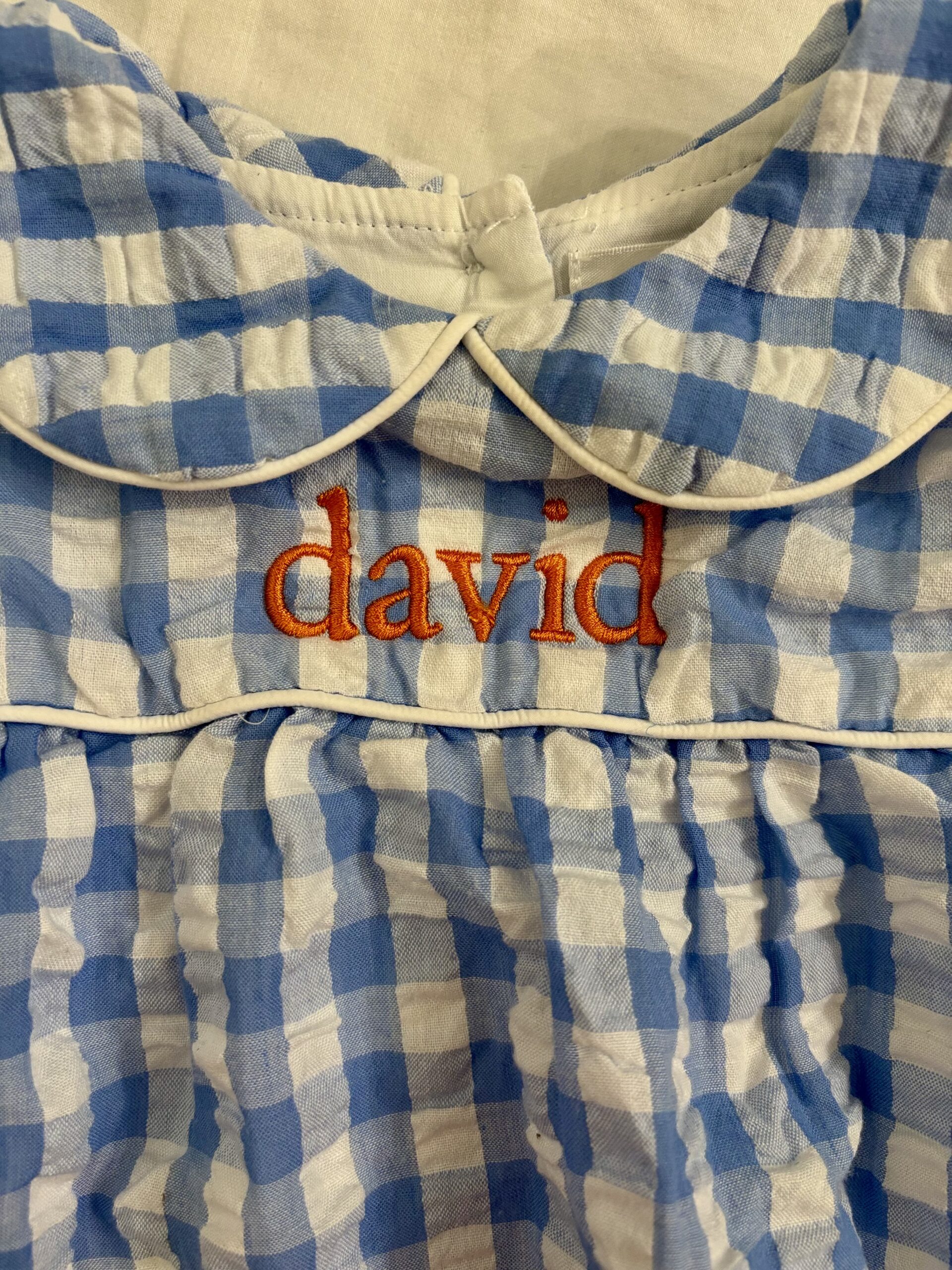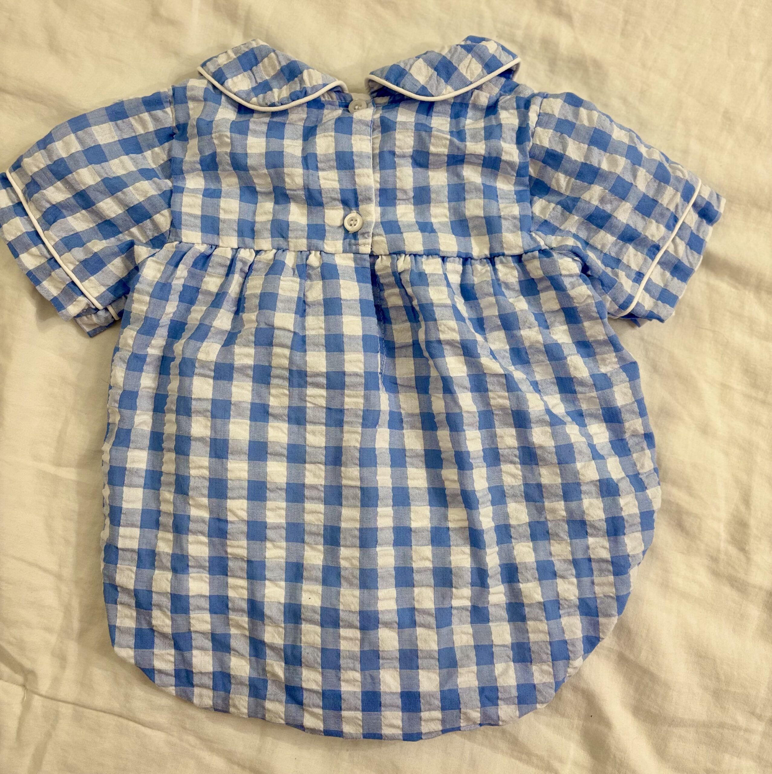 Gingham blue smocked “David” romper. Size: 18 months. Condition: like new. Brand: Cecil and Lou