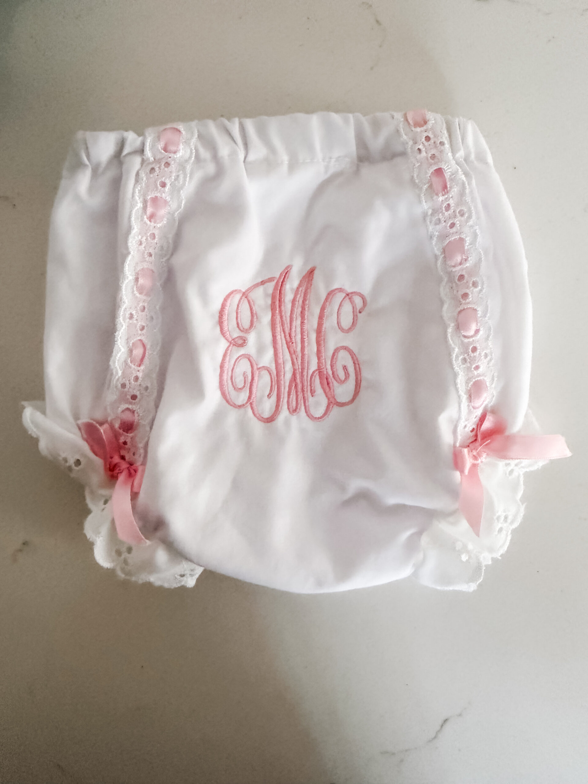 Classic diaper cover with delicate lace trim and ribbon detail, finished with “ECM” stitched across the back. A timeless piece that adds a sweet, traditional touch to any outfit.