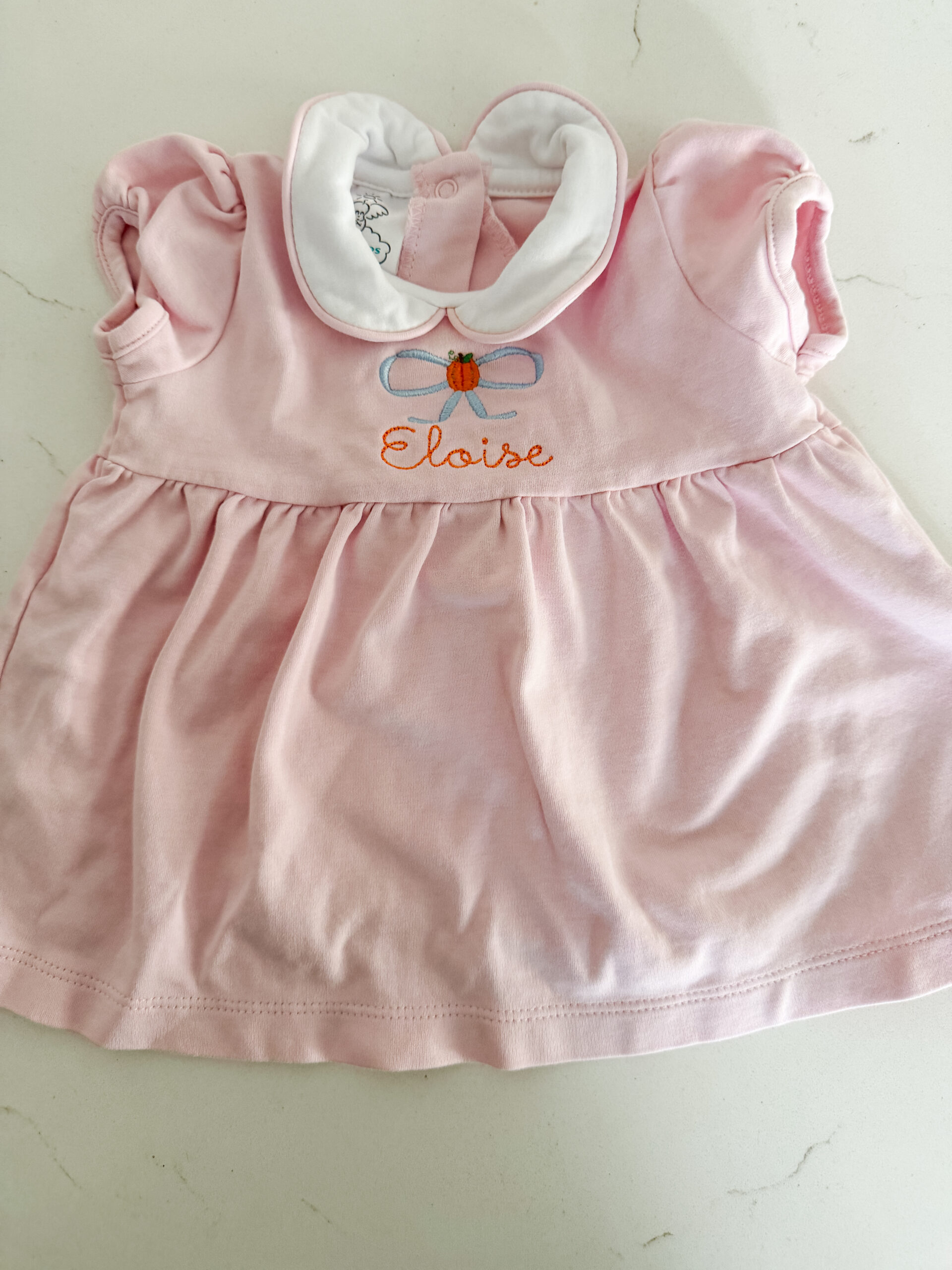 Sweet Bambino’s dress in soft pink with a classic white collar, featuring a charming pumpkin and bow embroidery with “Eloise” stitched just below. The details are timeless and perfect for fall events, photos, or everyday wear.