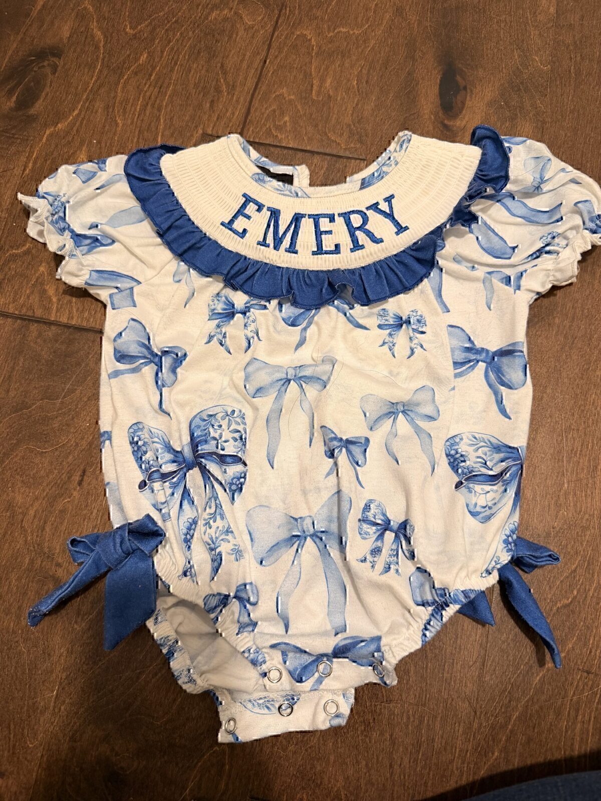 Brand is Cutie Toots, Emery bow bubble. Size is 6-12 month.