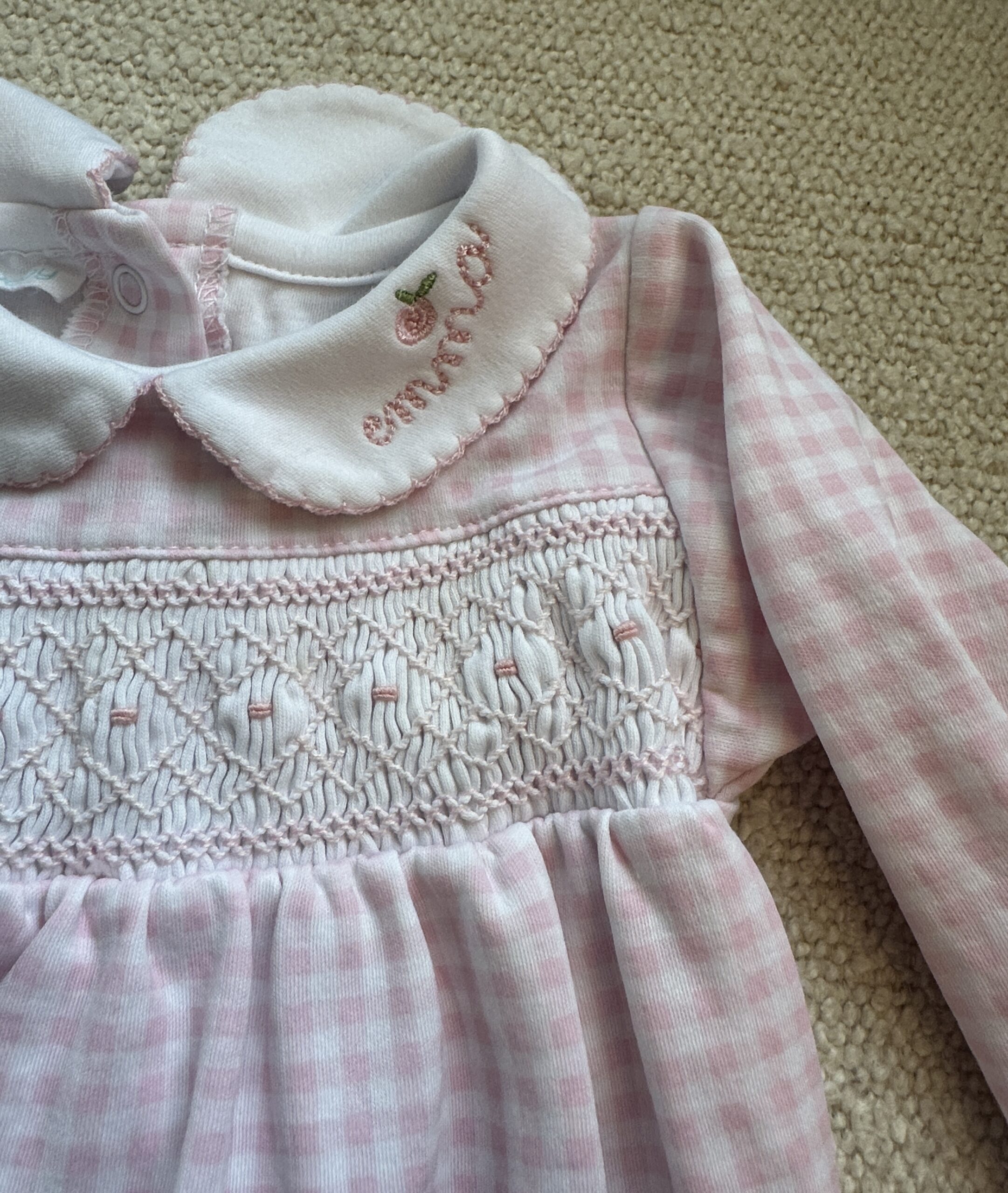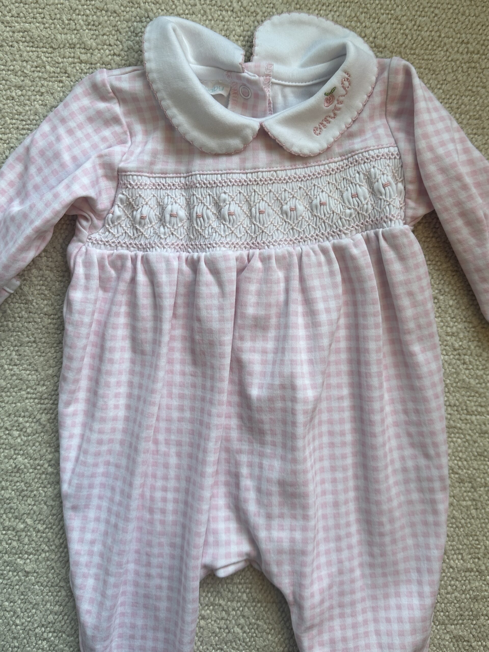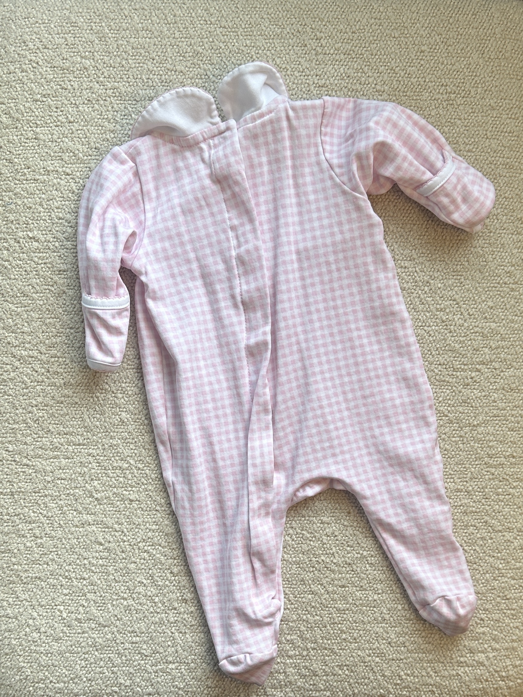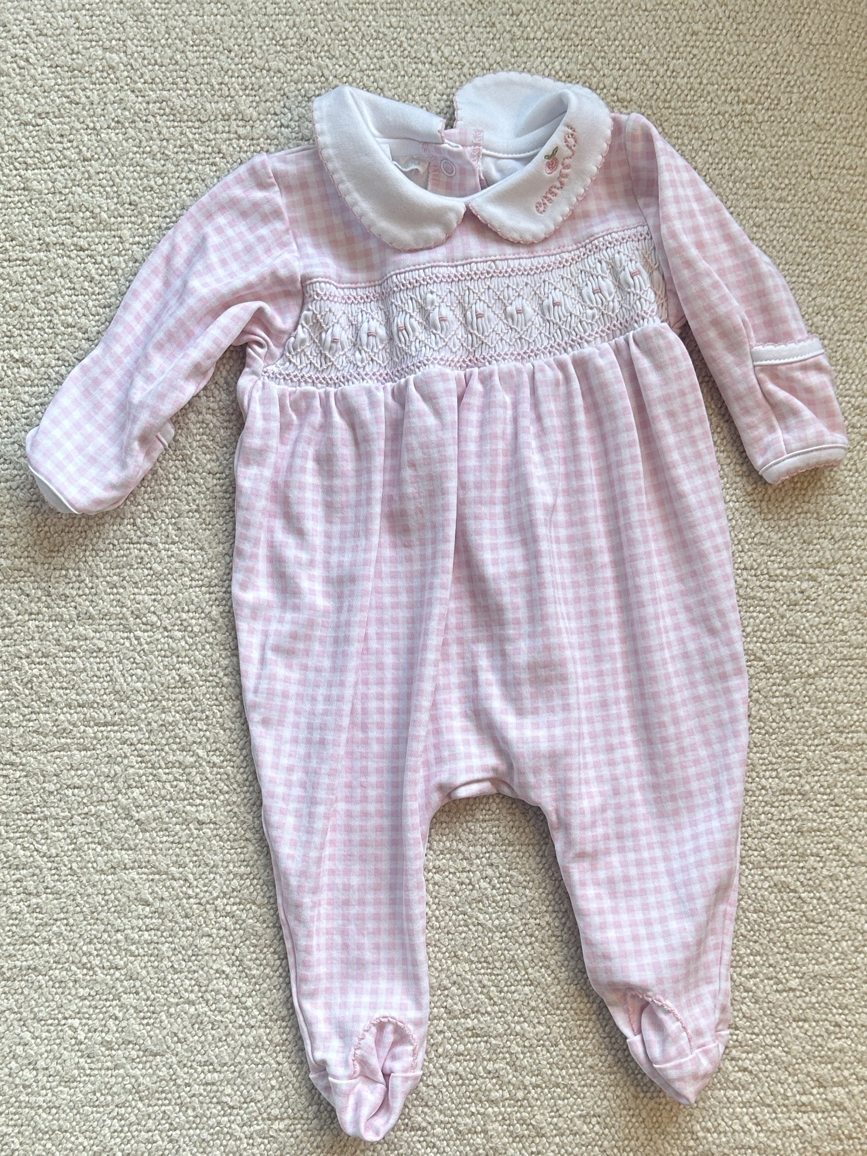 Magnolia Baby Pink Checkered Baby Footie with Emma Stitching. EUC.