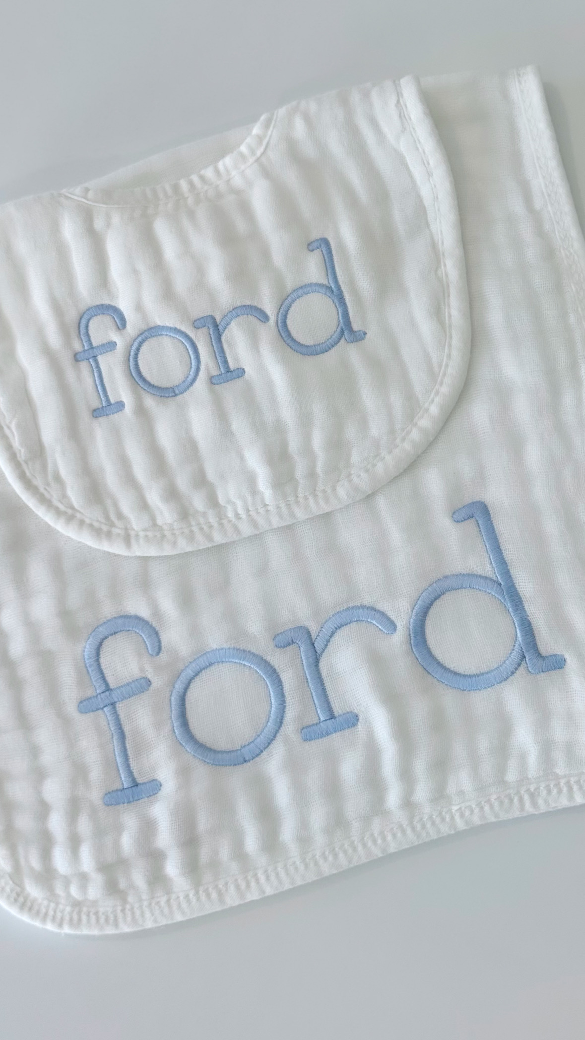Muslin Bib & Burp Cloth Set. Name: Ford