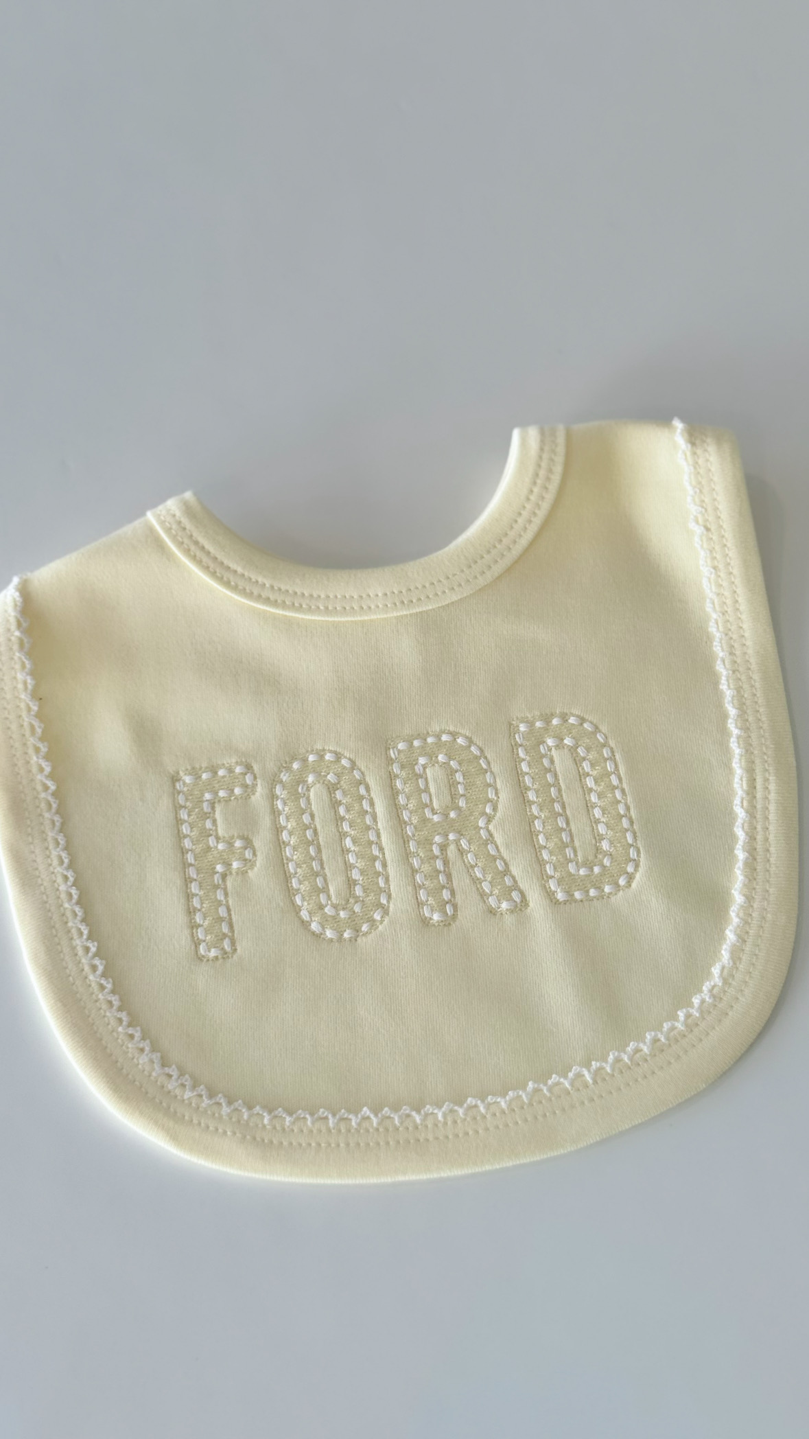 Yummy Butter Yellow with White Picot Trim. 100% Organic Cotton Bib. Name: FORD