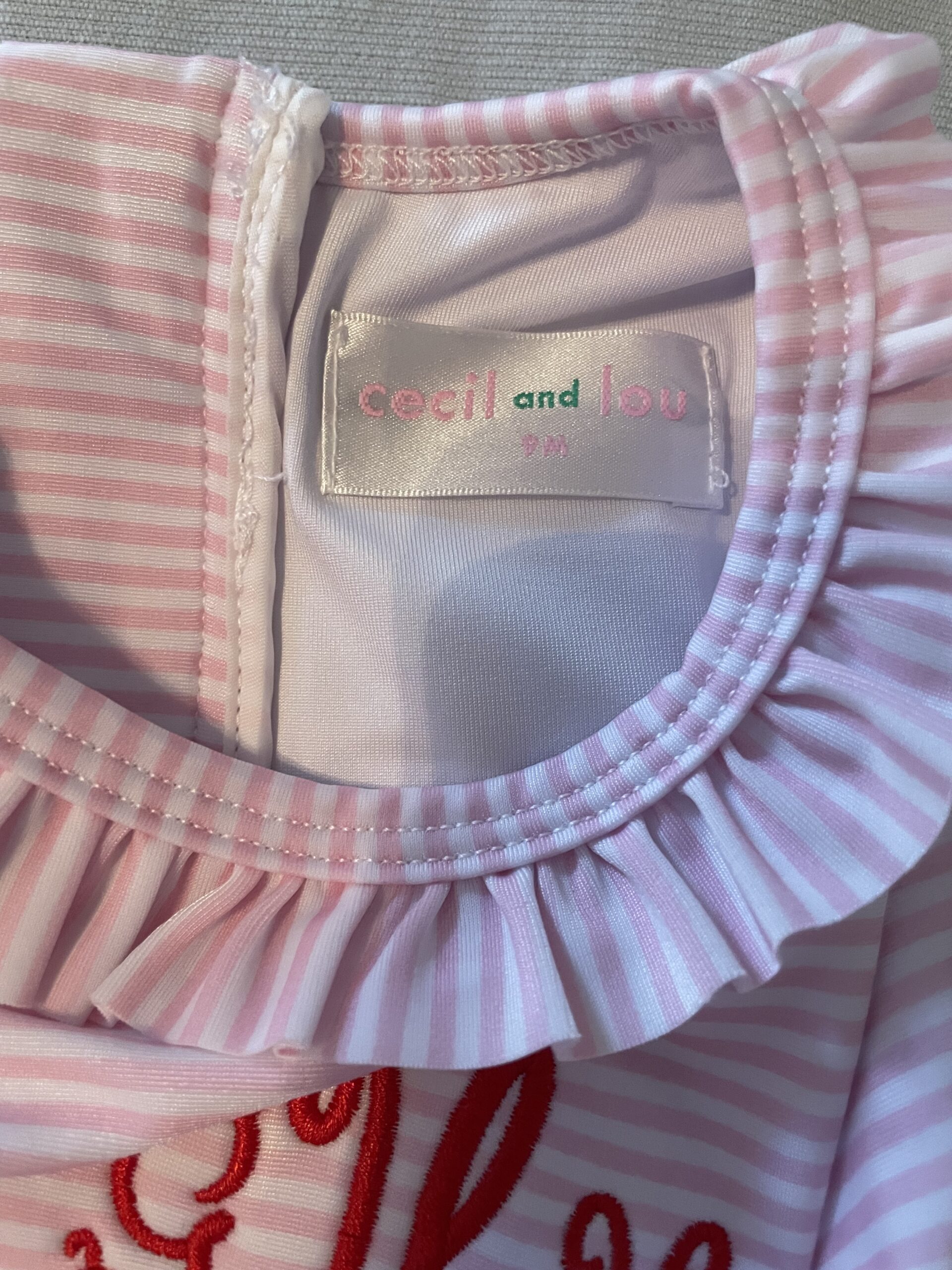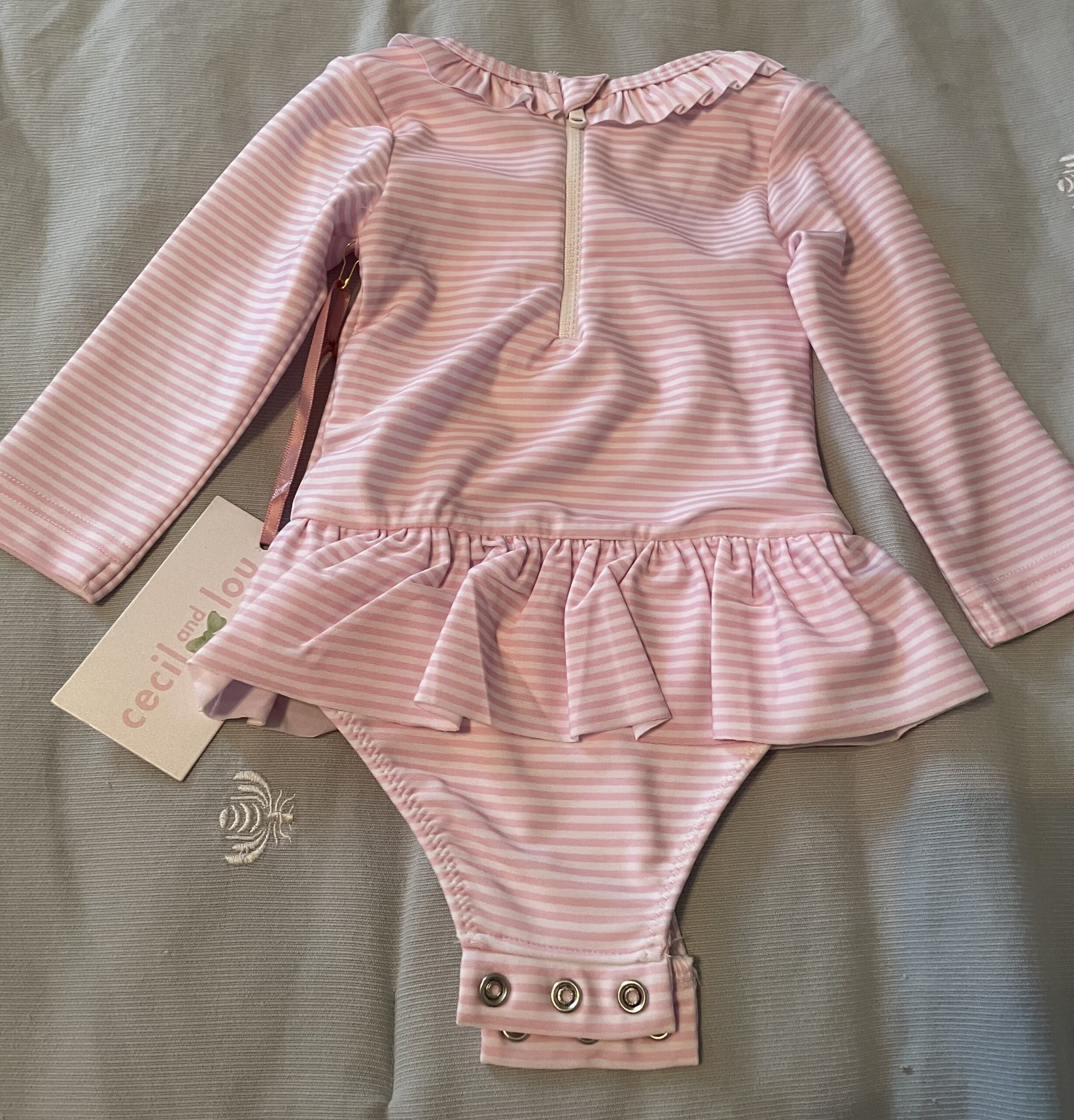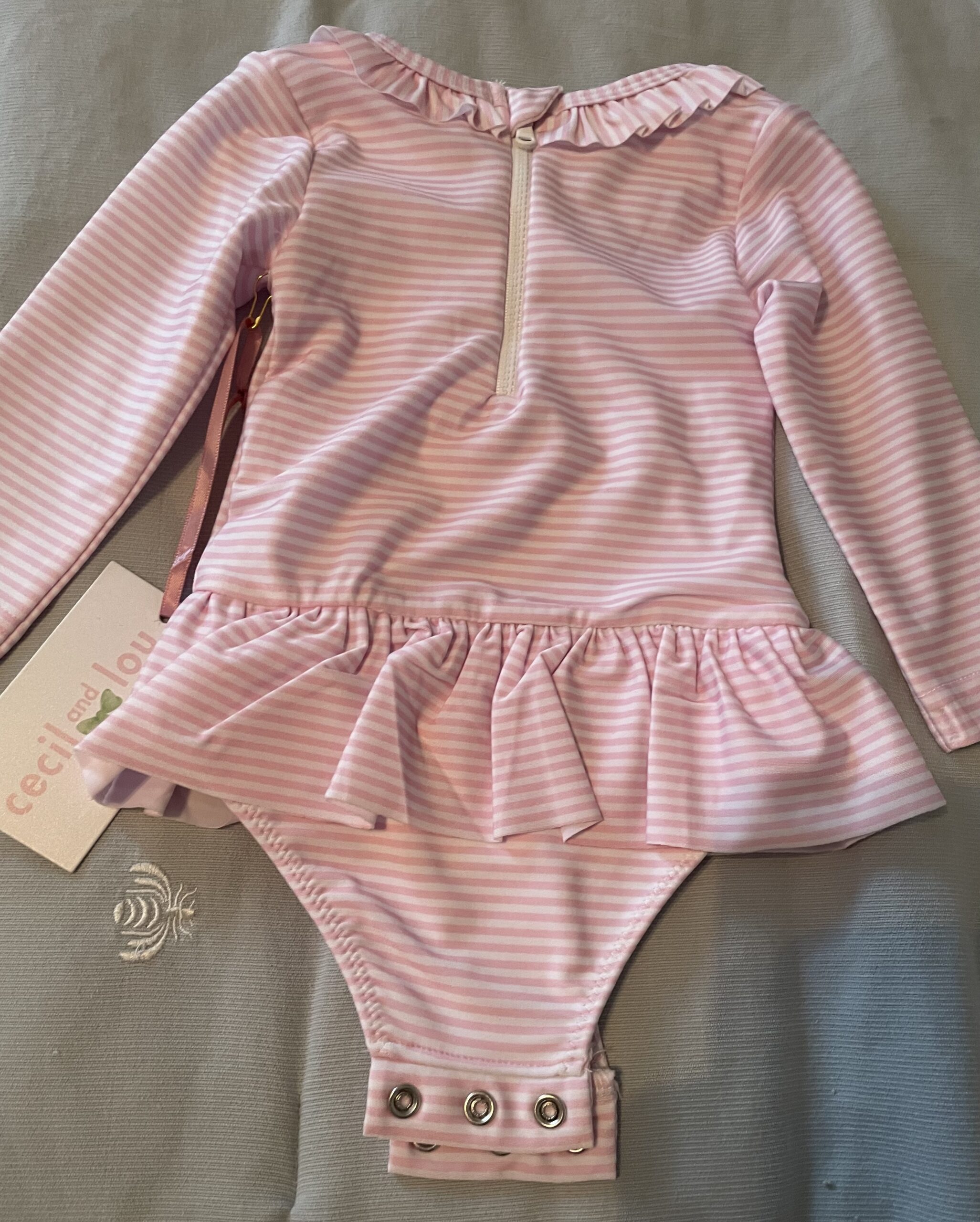 Swimsuit. Cecil & Lou 9 mo pink & white striped long sleeve swimsuit. New with tags. Initials with watermelons.