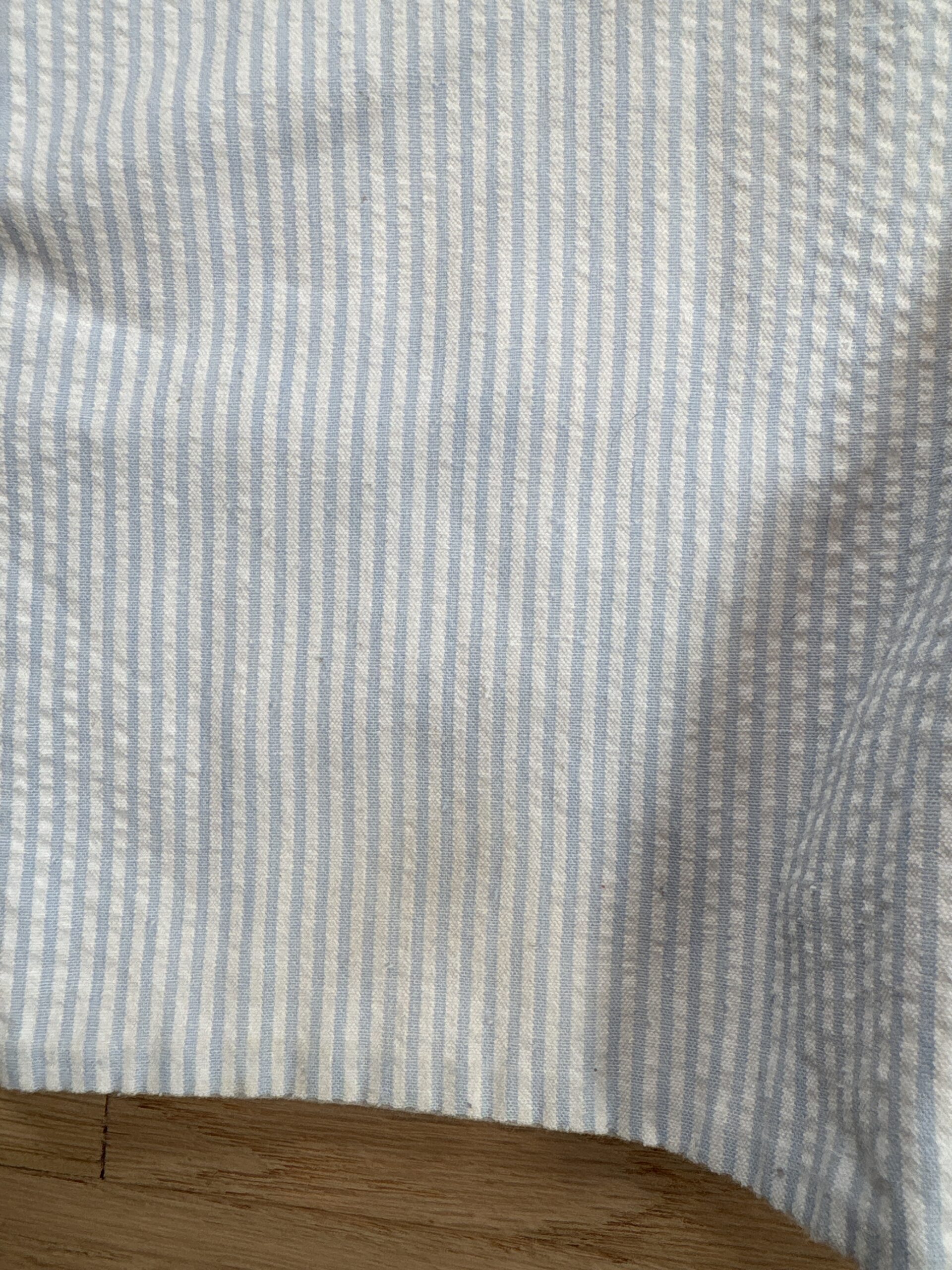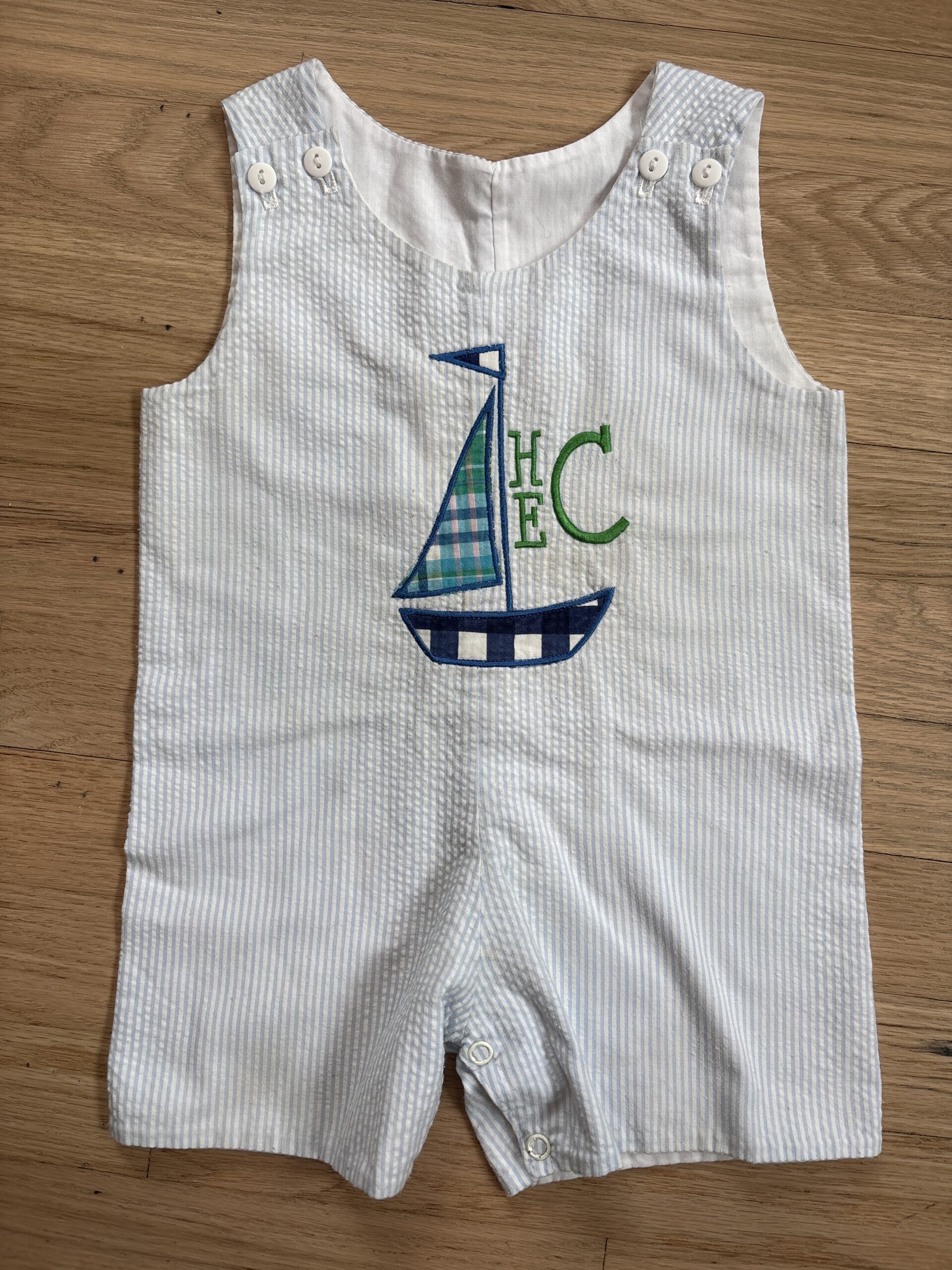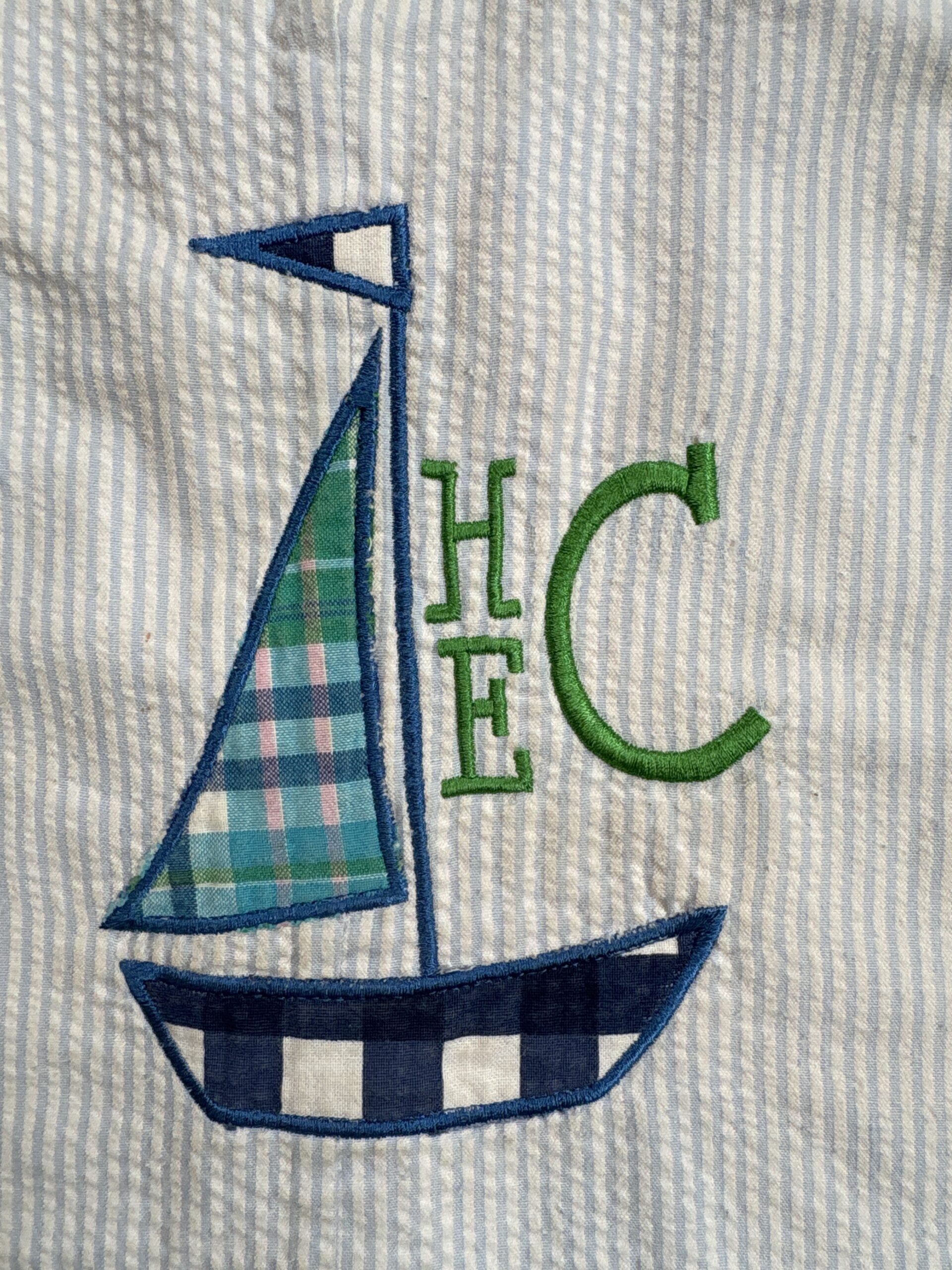 Blue and white seersucker Jon Jon. Sailboat appliqué with monogram. Some wash wear and a few untreated spots.