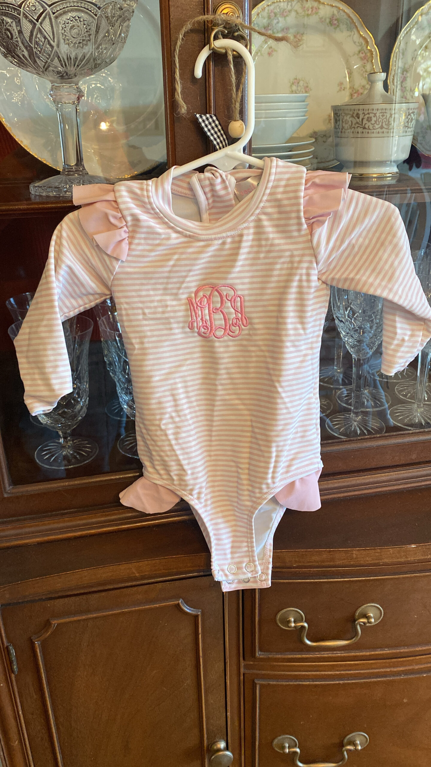 Cecil and Lou Swimsuit in a pink and white searsucker print