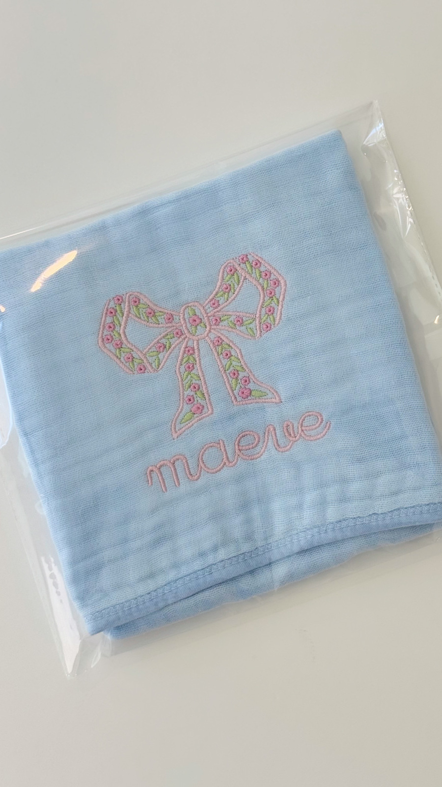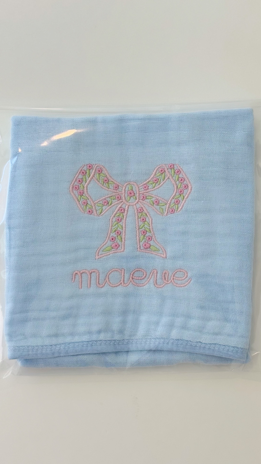 Muslin Burp Cloth. Name: Maeve + Flower Bud Bow