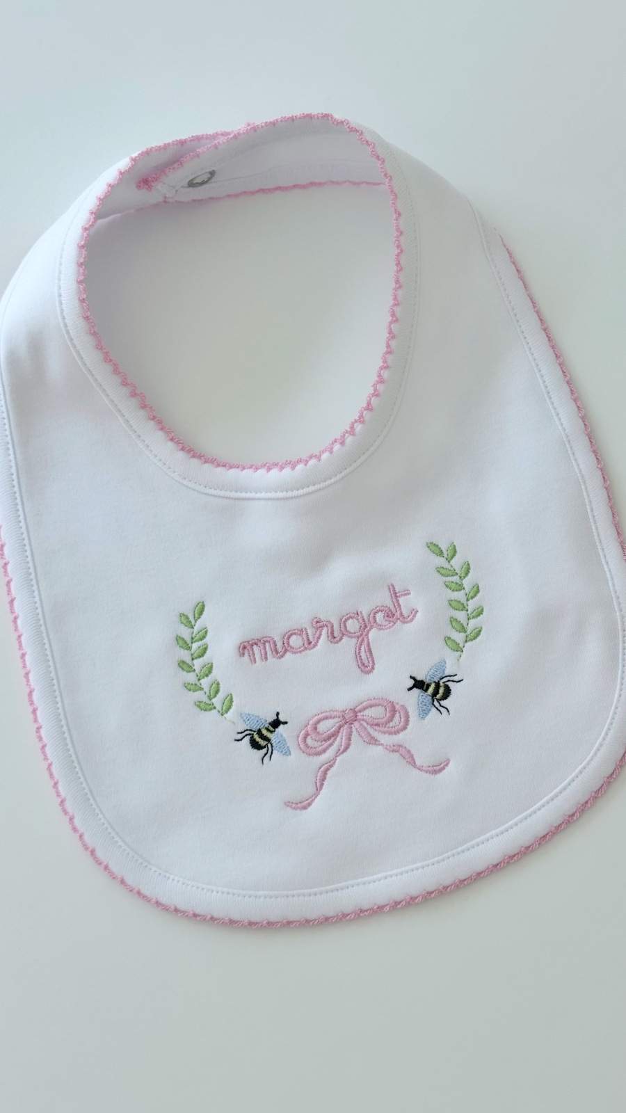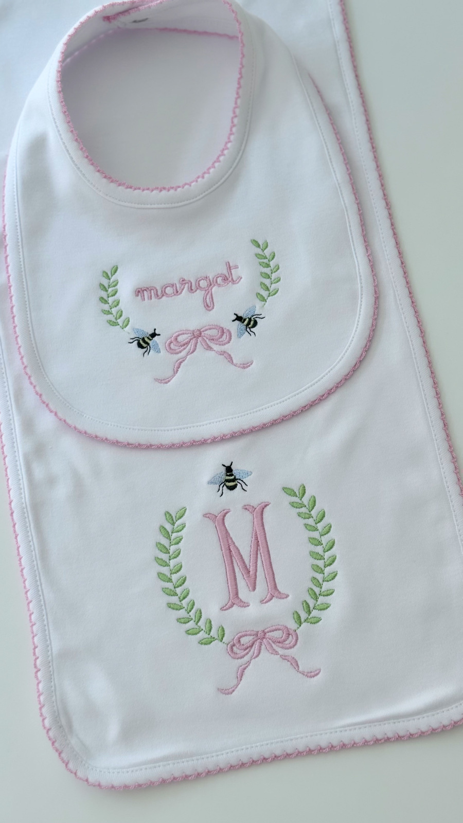 100% Cotton Bib and Burp Cloth Set with Pink Picot Trim. Name: Margot + Bee Laurel