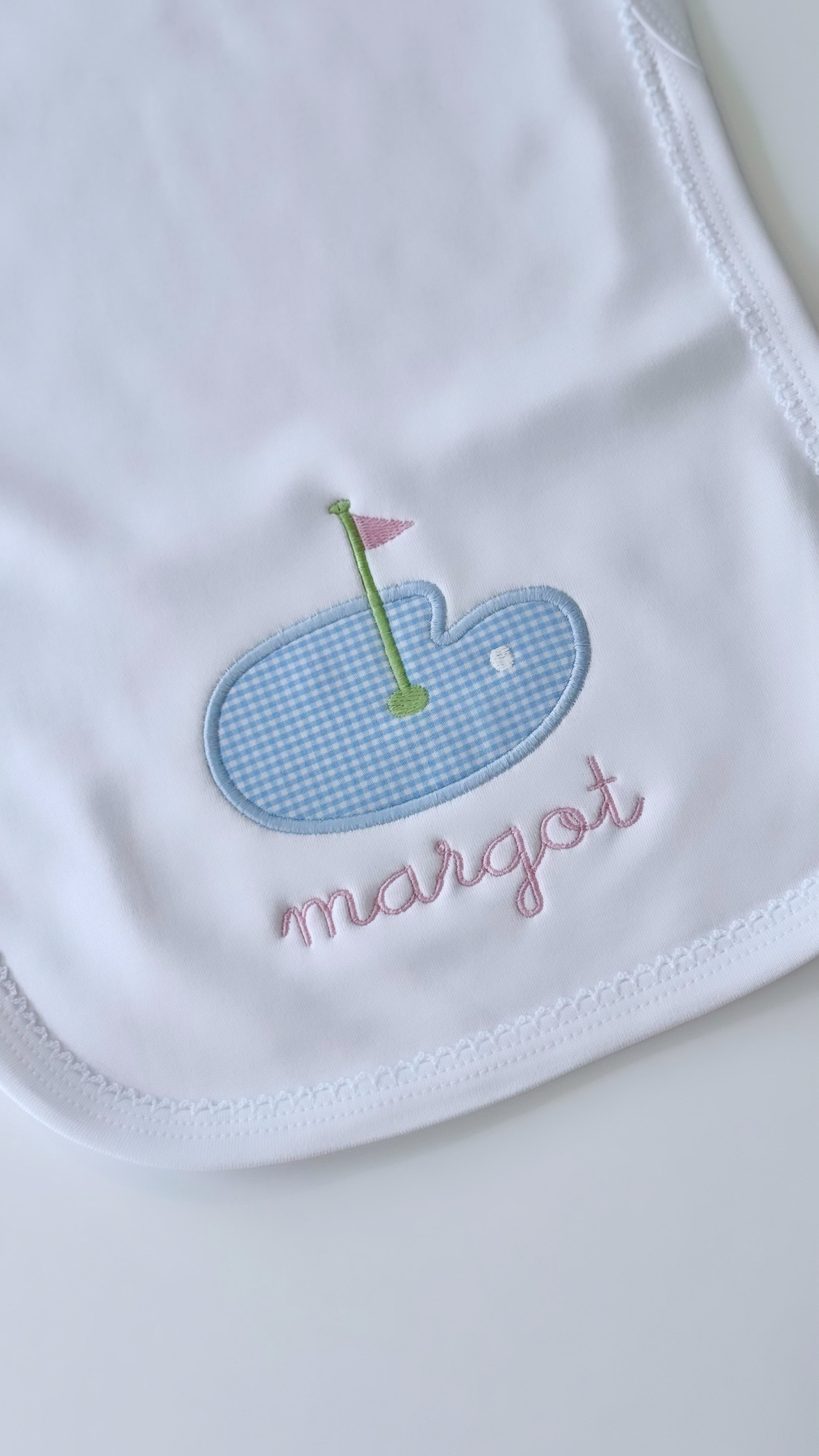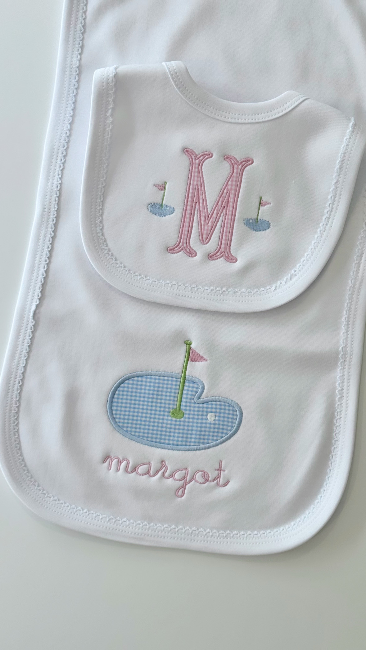 100% Cotton White Appliquéd Bib & Burp Cloth Set. Monogram: Margo/M + Golf