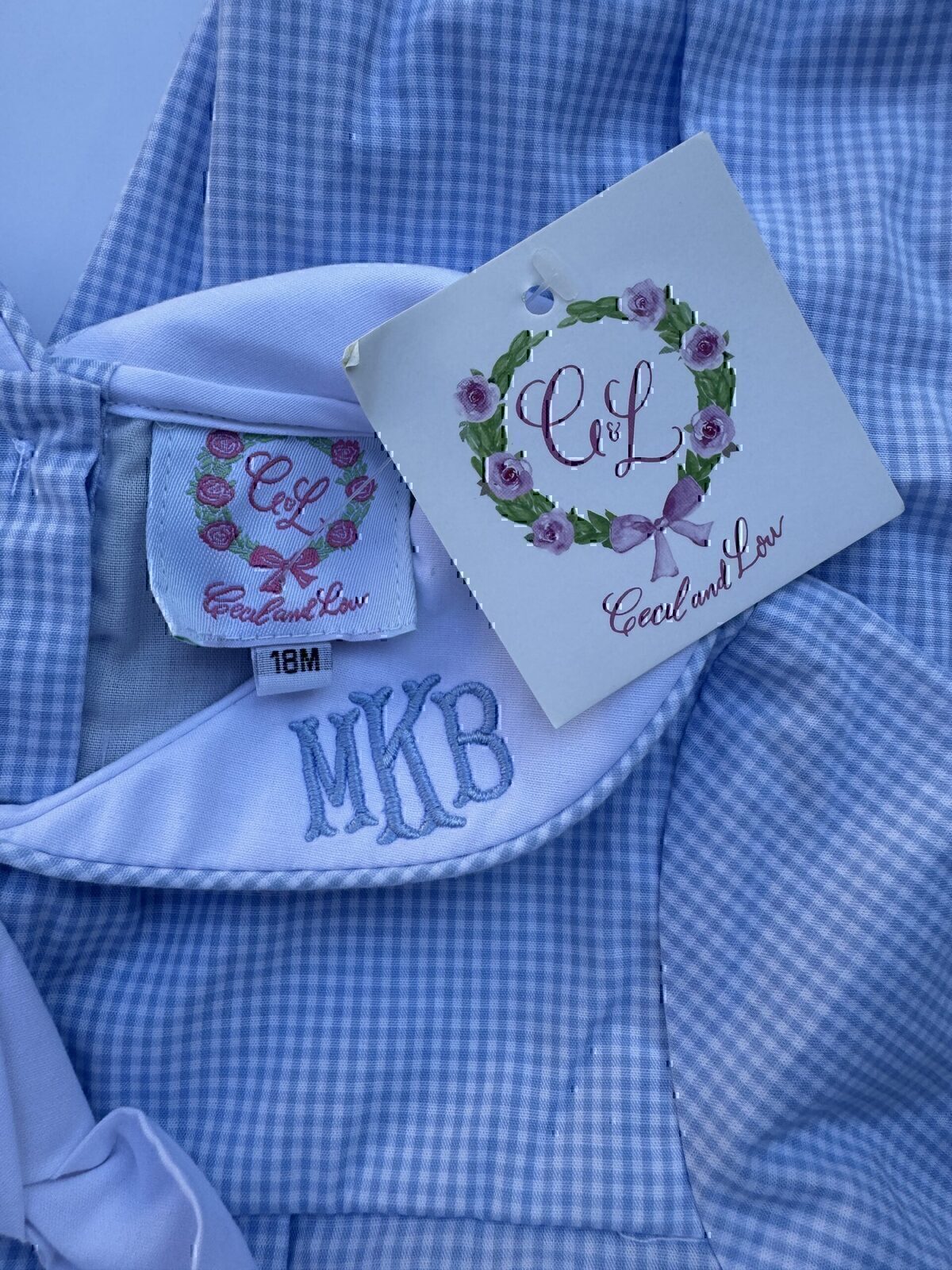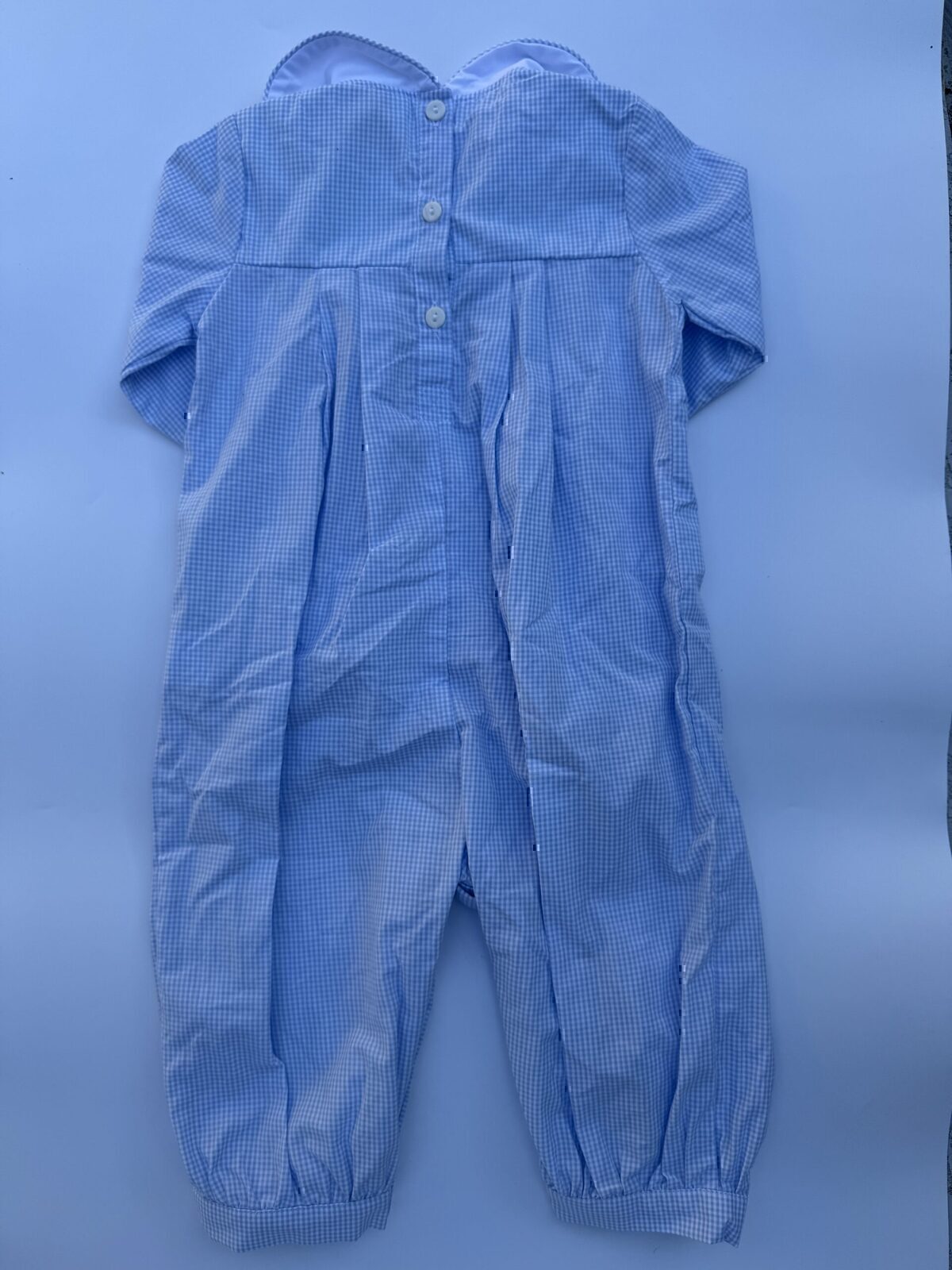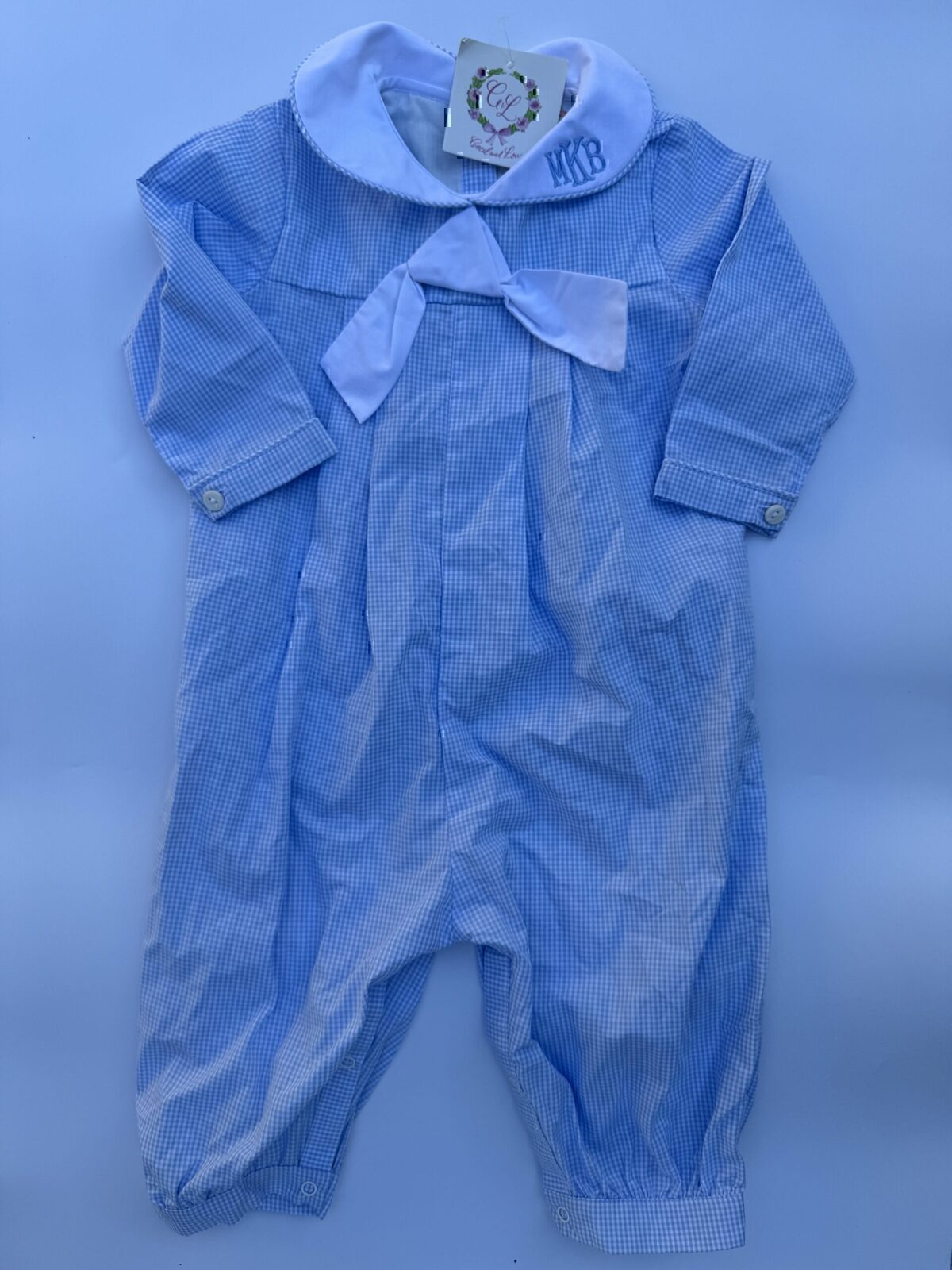 Cecil & Lou size 18m boys white and blue small check long sleeve jumper, new with tags and monogrammed with initials “MBK” on collar