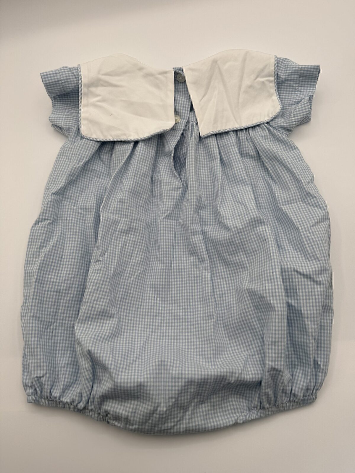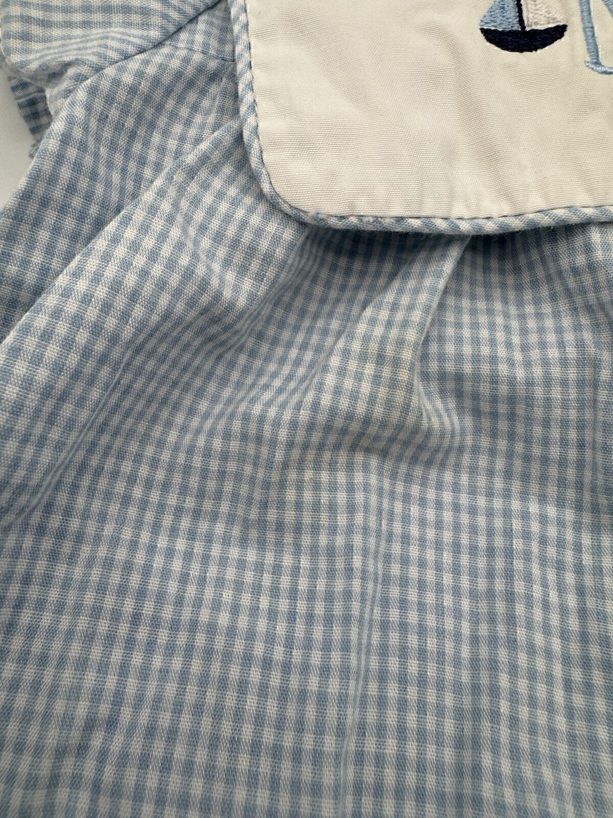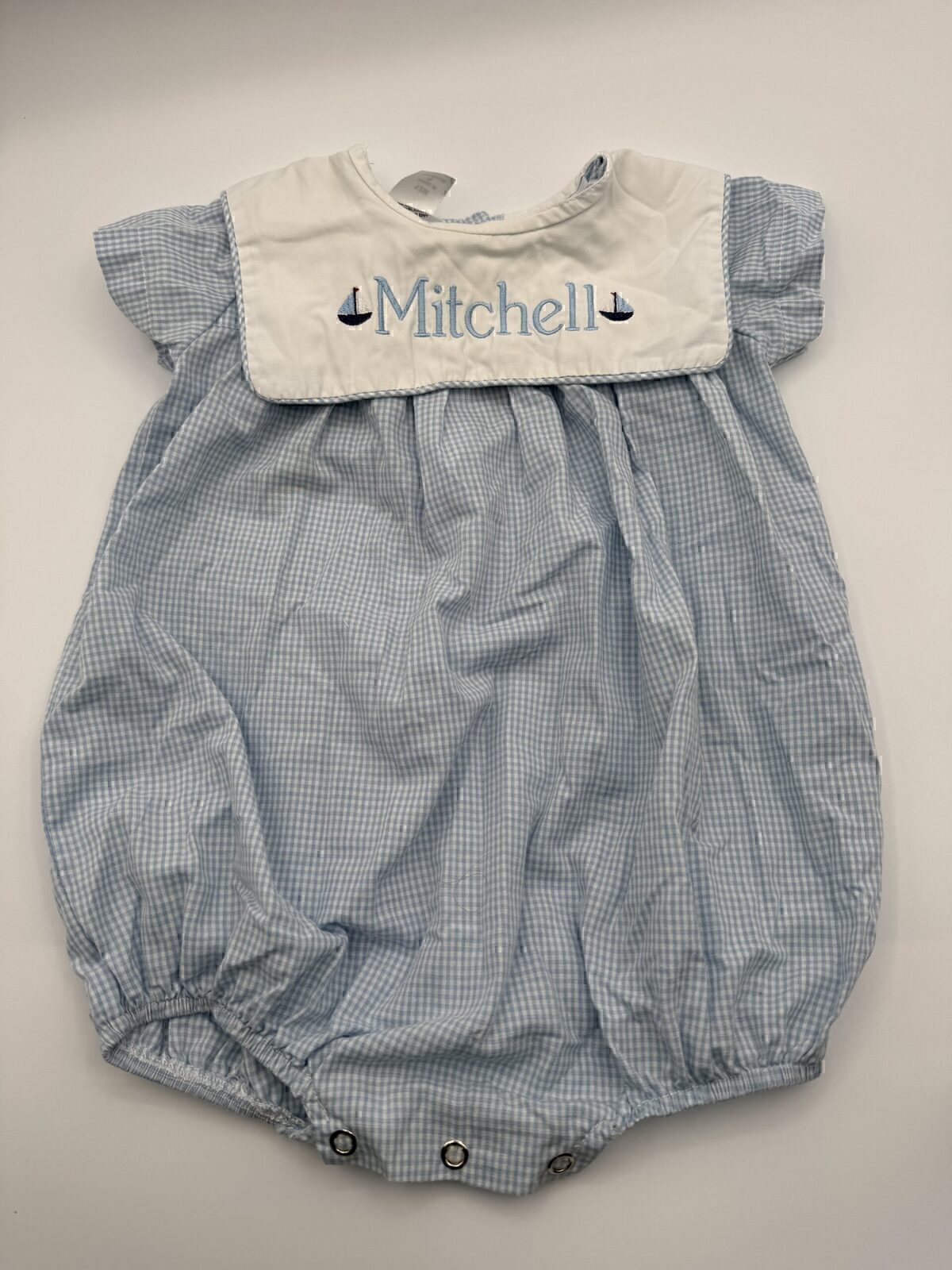 Boys size 12M bib blue and white plaid bubble with embroidered sail boats, monogrammed name “Mitchell” in light blue thread, barely visible stain on front, photographed. Please review all photos prior to purchasing.