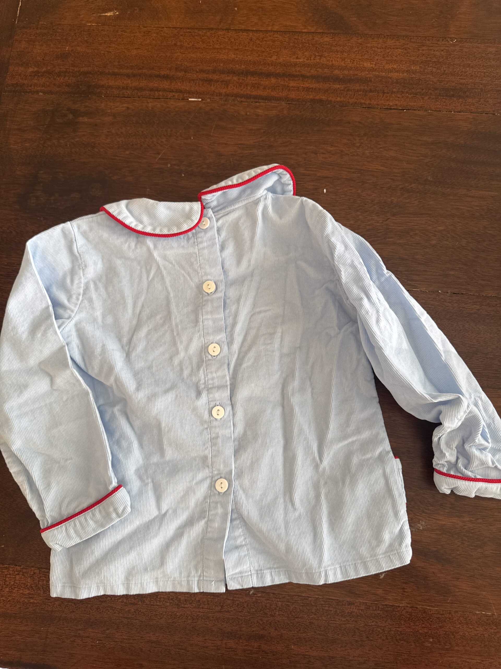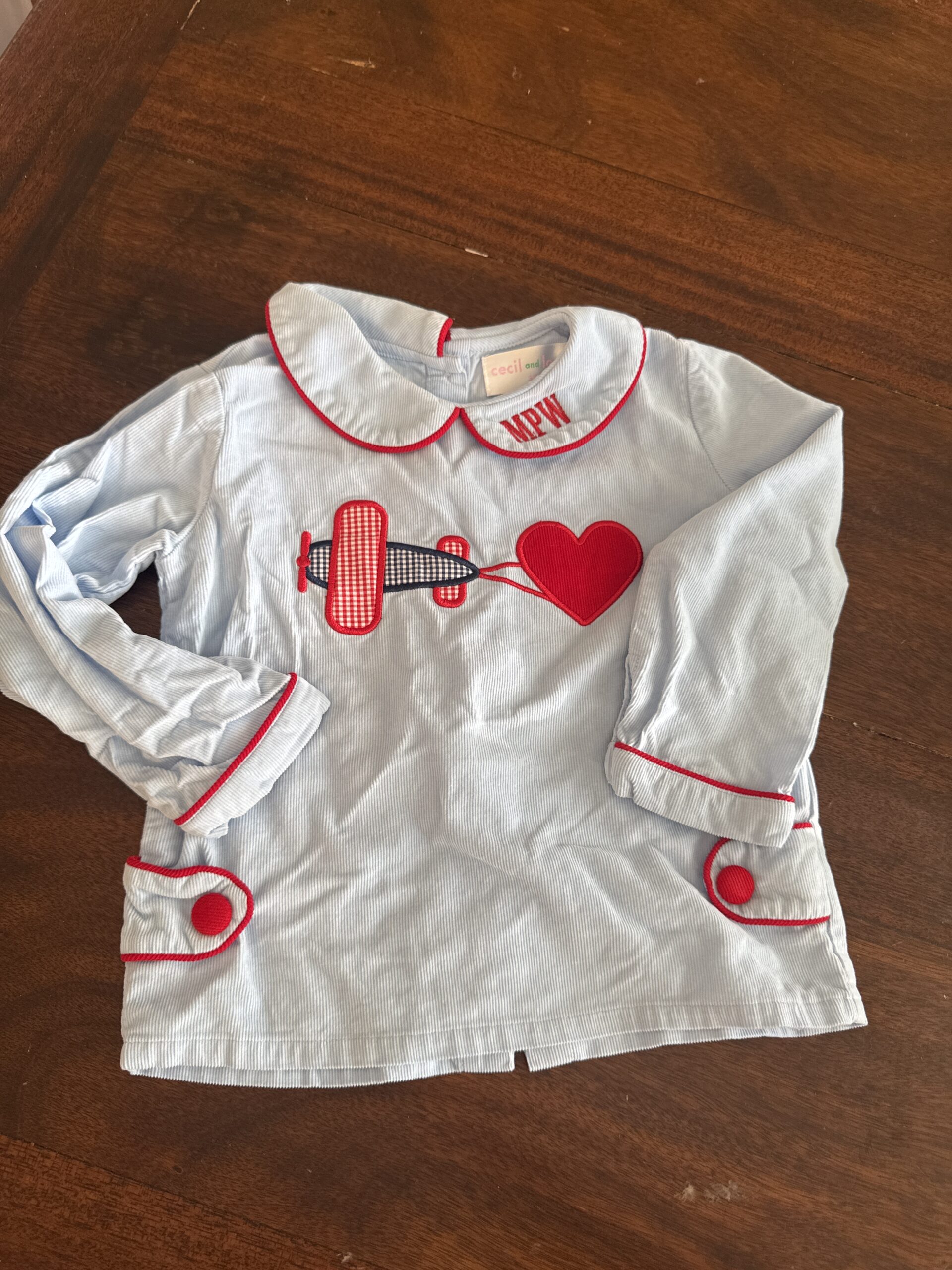 Boys valentines top. Material is cord. Some possible faint bleeding from the red, but might be my eyes. Wrinkles from storage.