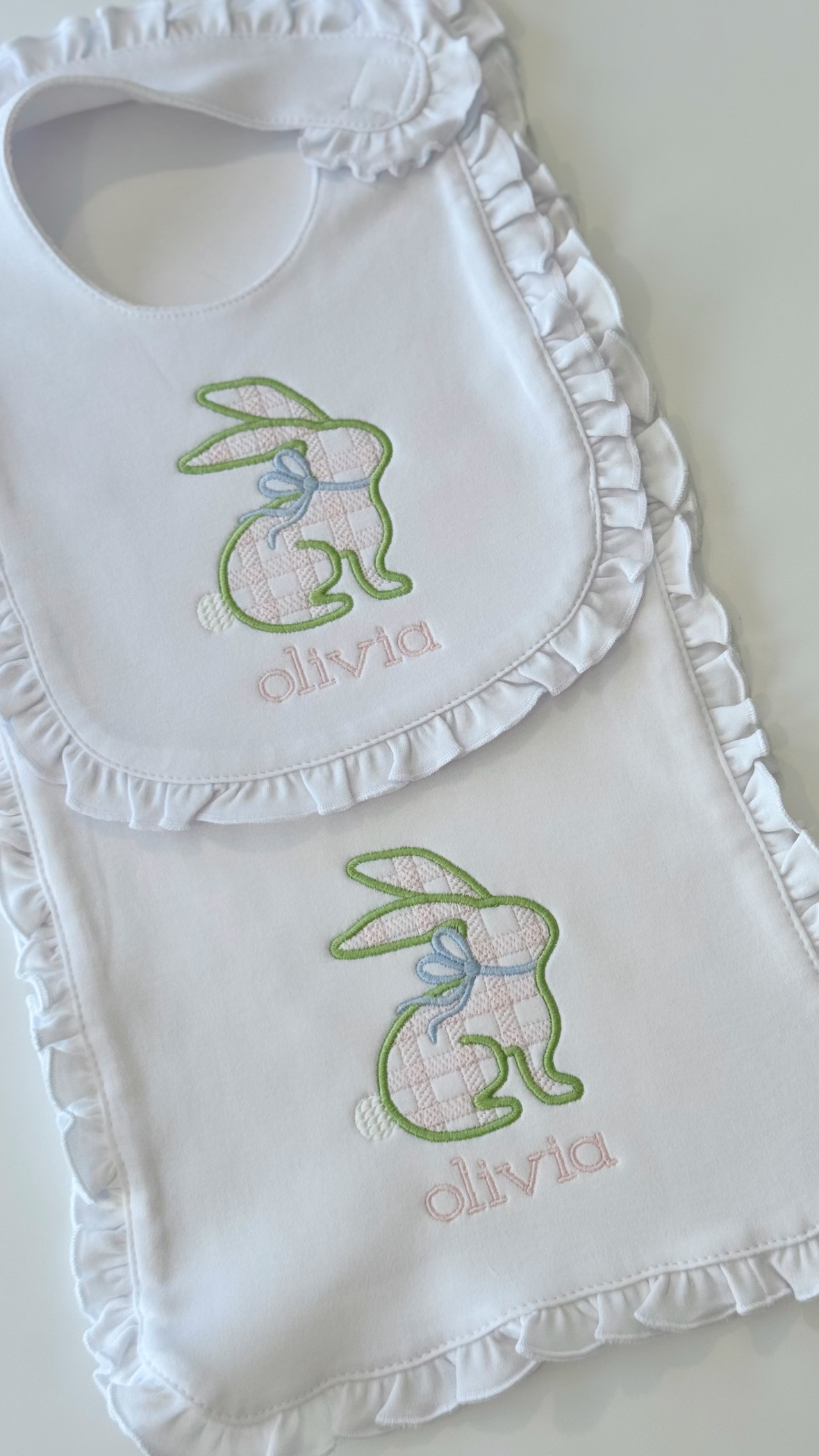 100% Cotton Bib and Burp Cloth Set. Name : Olivia + Gingham Bunny