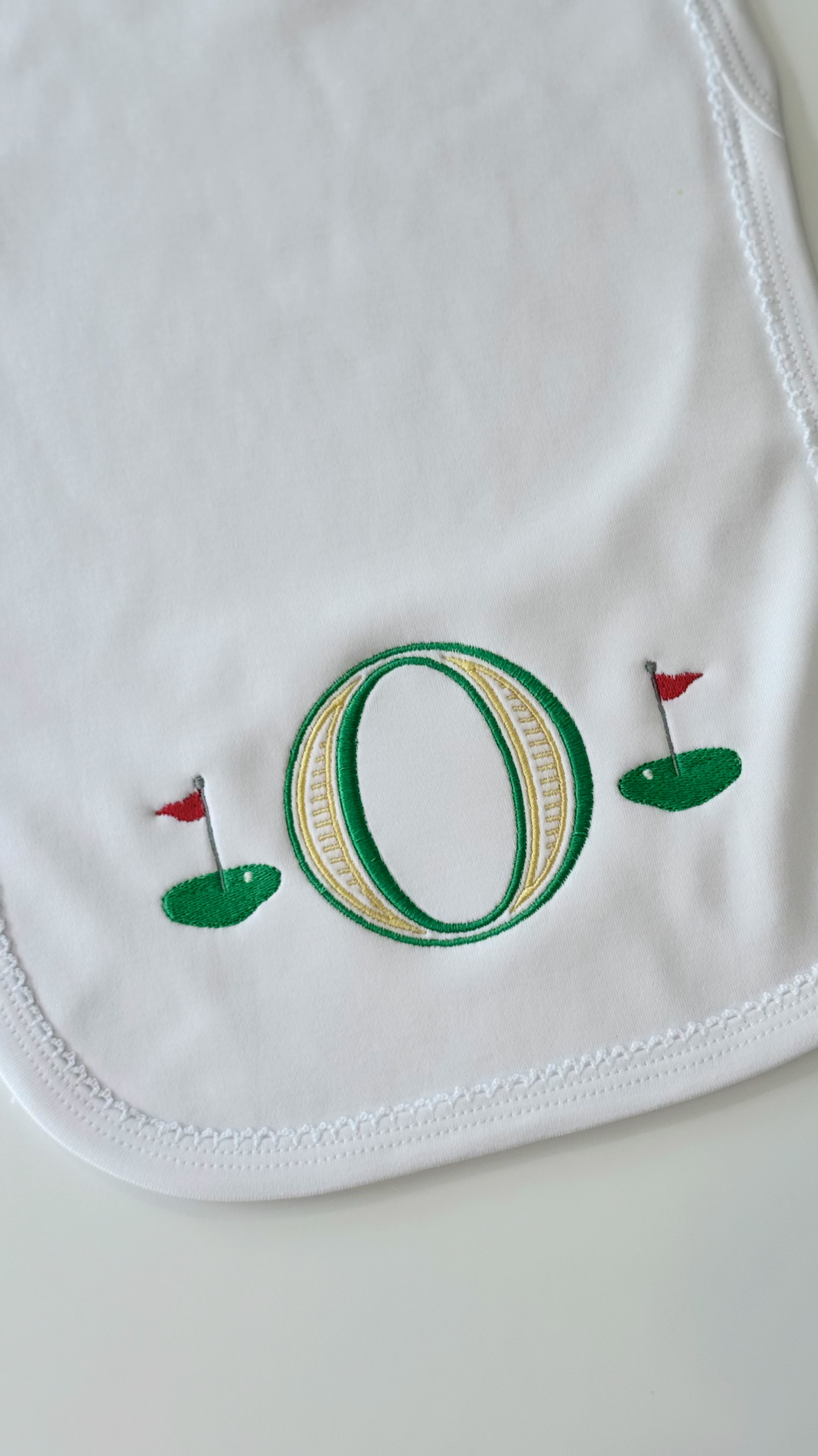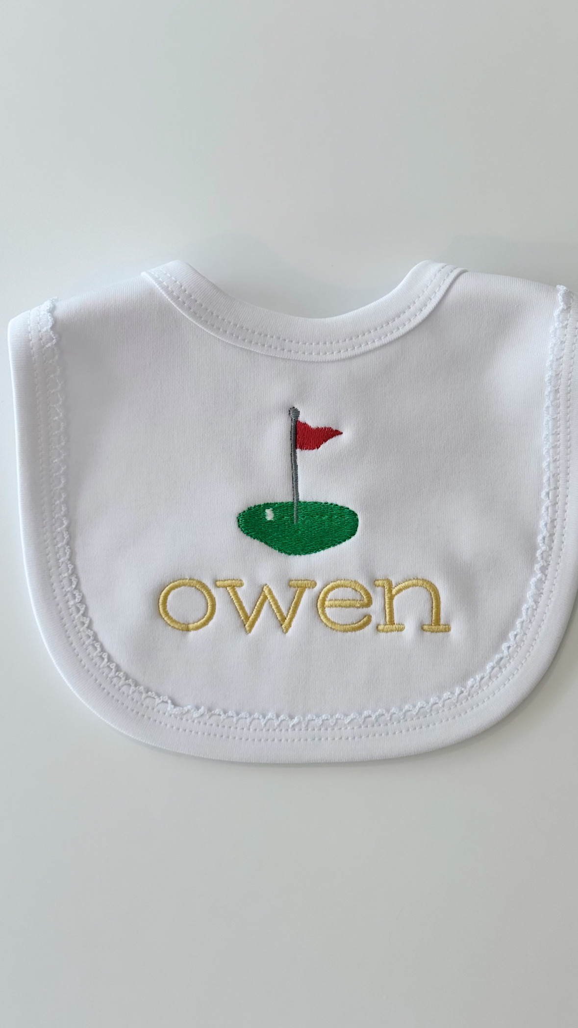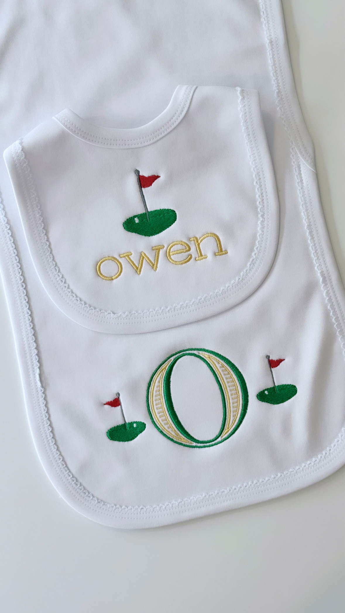 100% Cotton Bib and Burp Cloth Set. Name : Owen + Golf