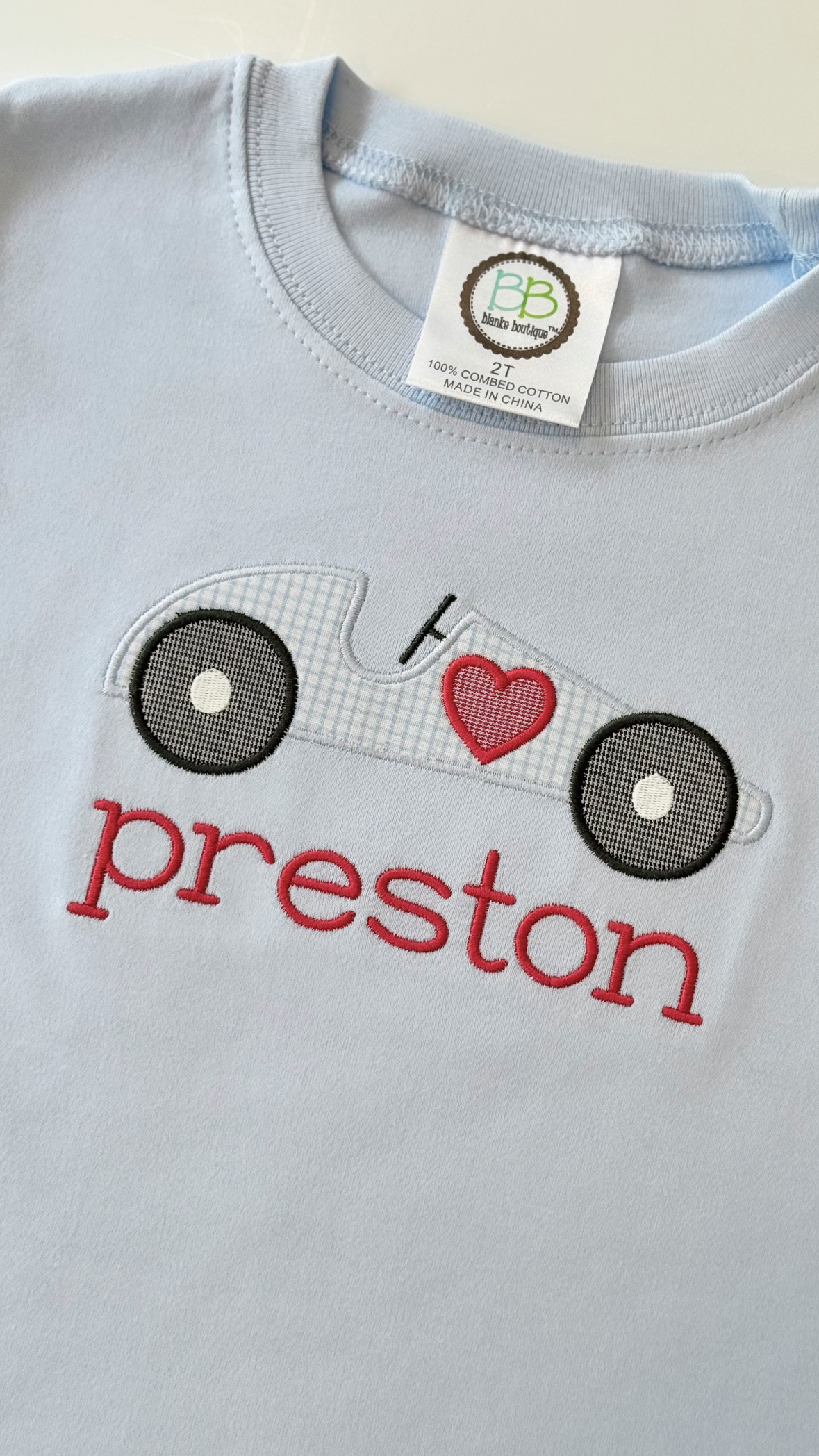100% Cotton Short Sleeve Shirt. Name: Preston + appliquéd Valentine’s Day Themed Race Car