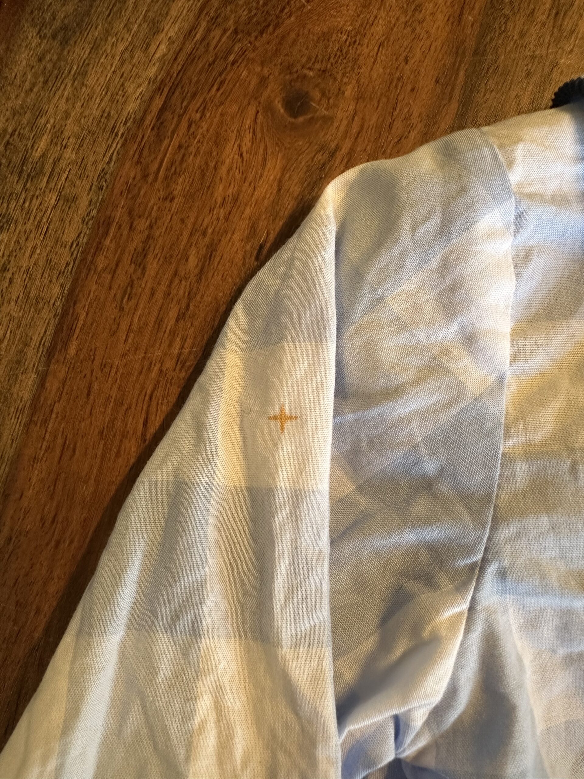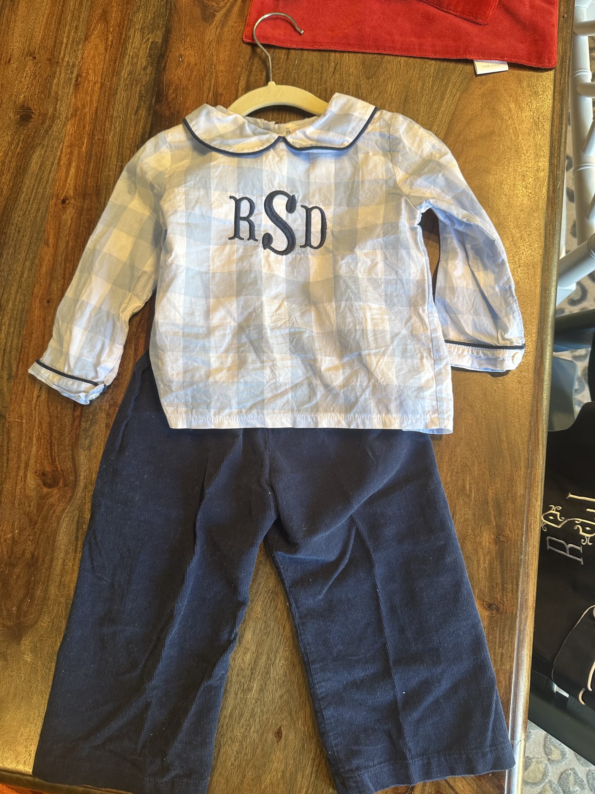 The smocking place set. Navy corduroys. Small mark on one sleeve that was already on fabric during production