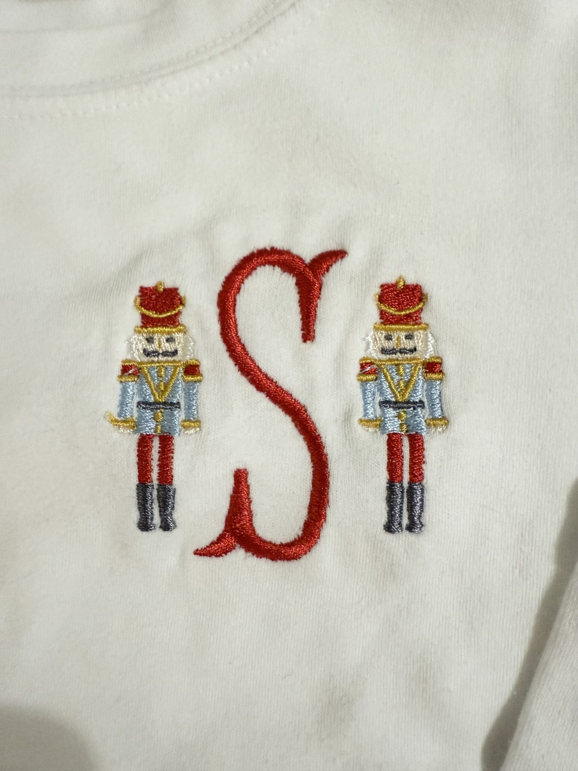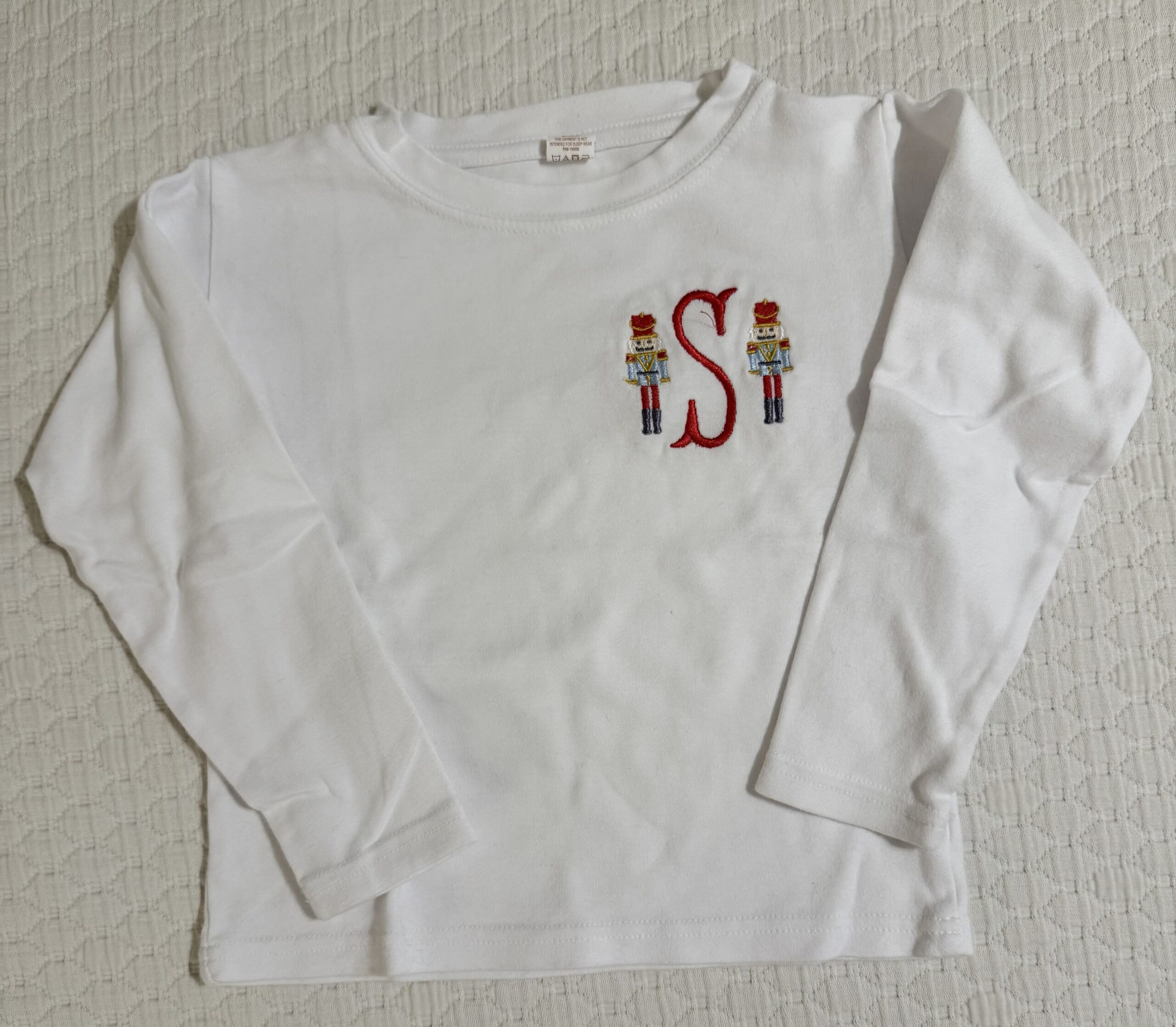 White, long sleeve 100% cotton tshirt with red S and Christmas nutcrackers.