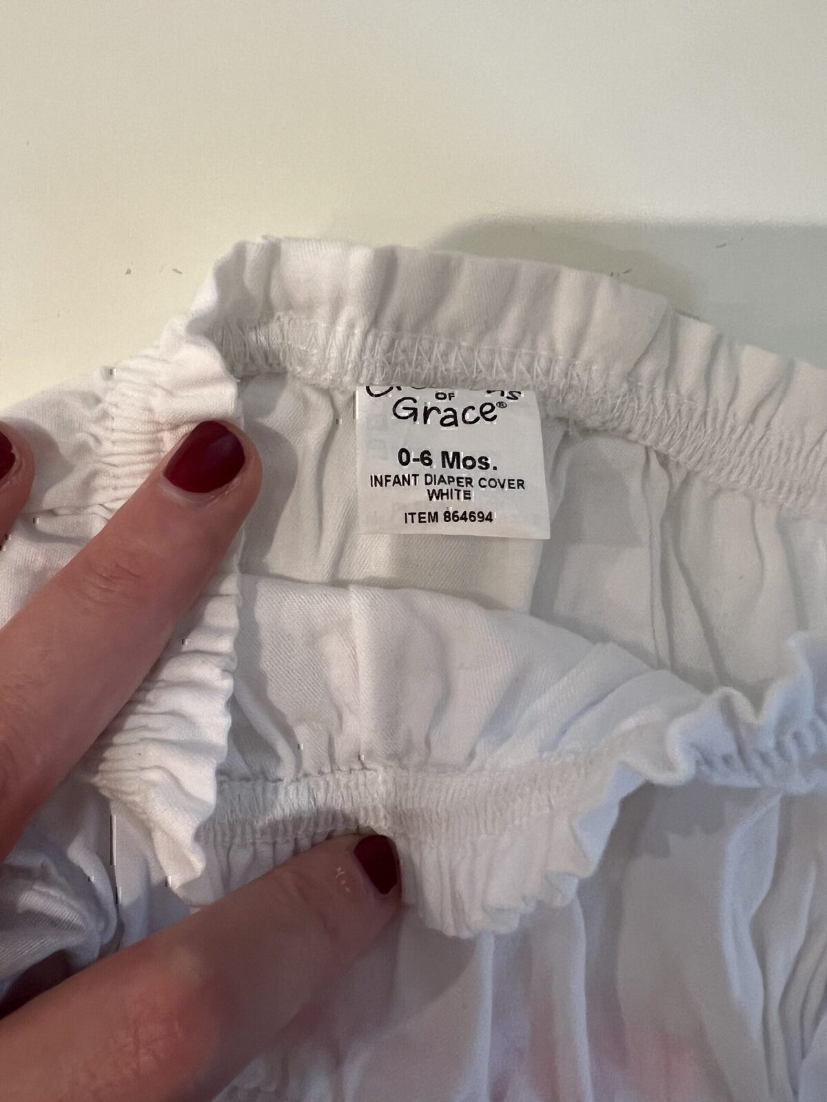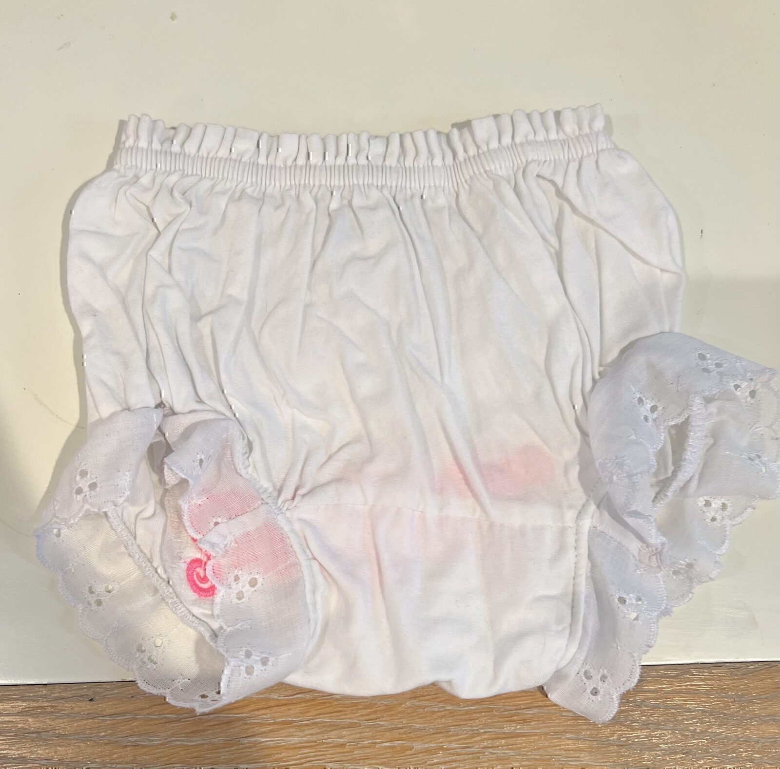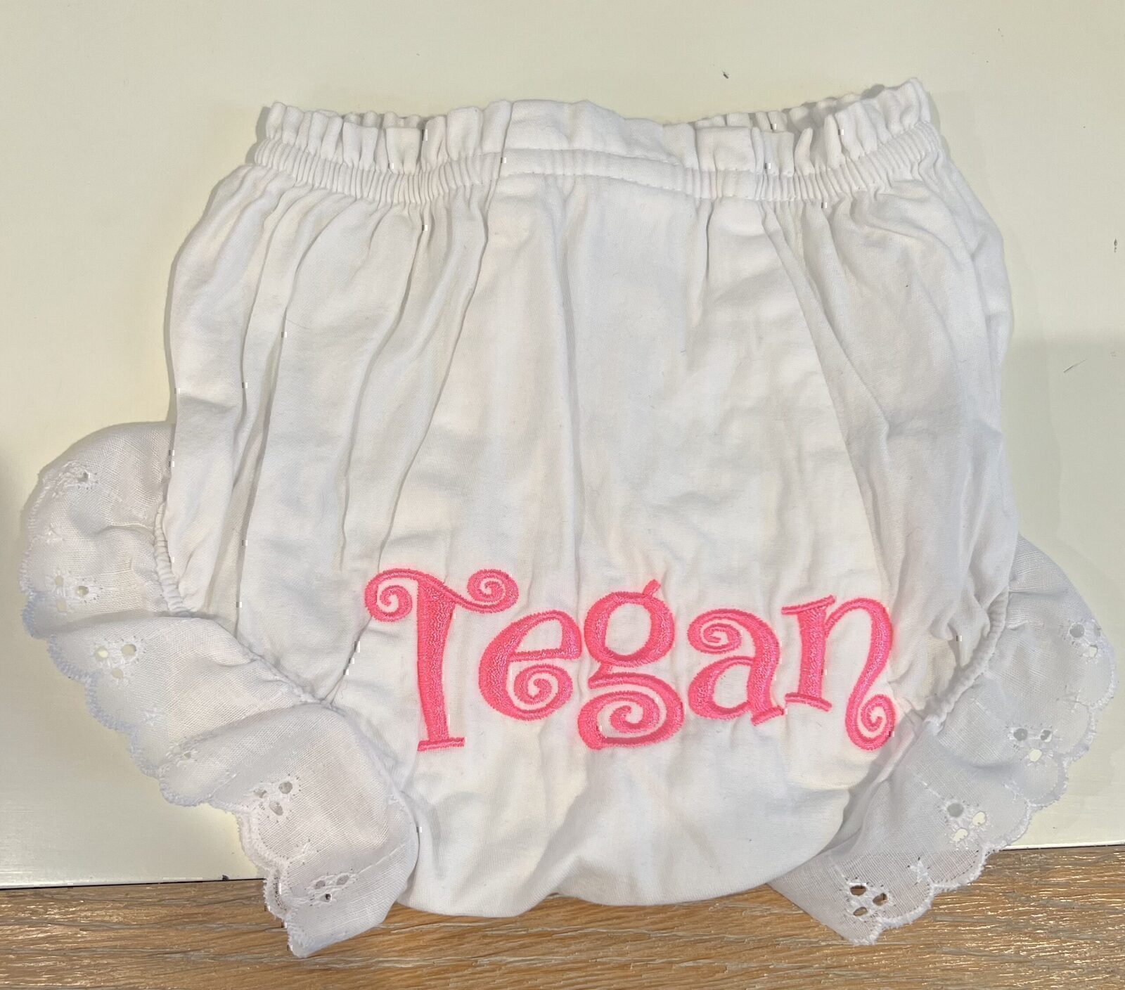 ♥White Eyelet Bloomer with hot pink embroidered “Tegan”. Great condition, 0-6 months.