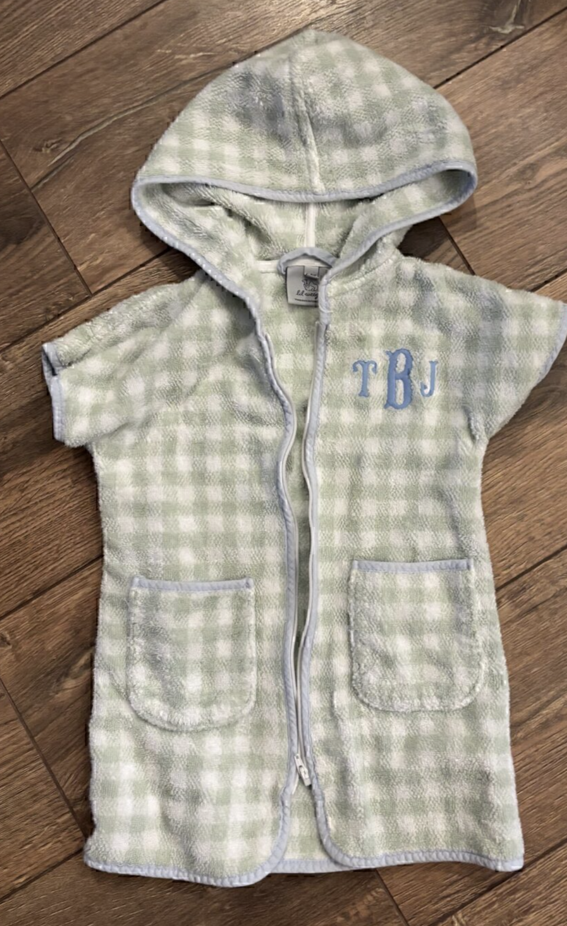 Weezie towels brand beach cover up. Thick and plush material. Retails for $72 without a monogram. Like new. Perfect for the beach, swim lessons, bath time or the pool! I loved the fact that the kids didn’t have a tripping hazard after they got out of the house water by not wrapping them in a towel! Size is 3-4 years. We wore well after 4 years.