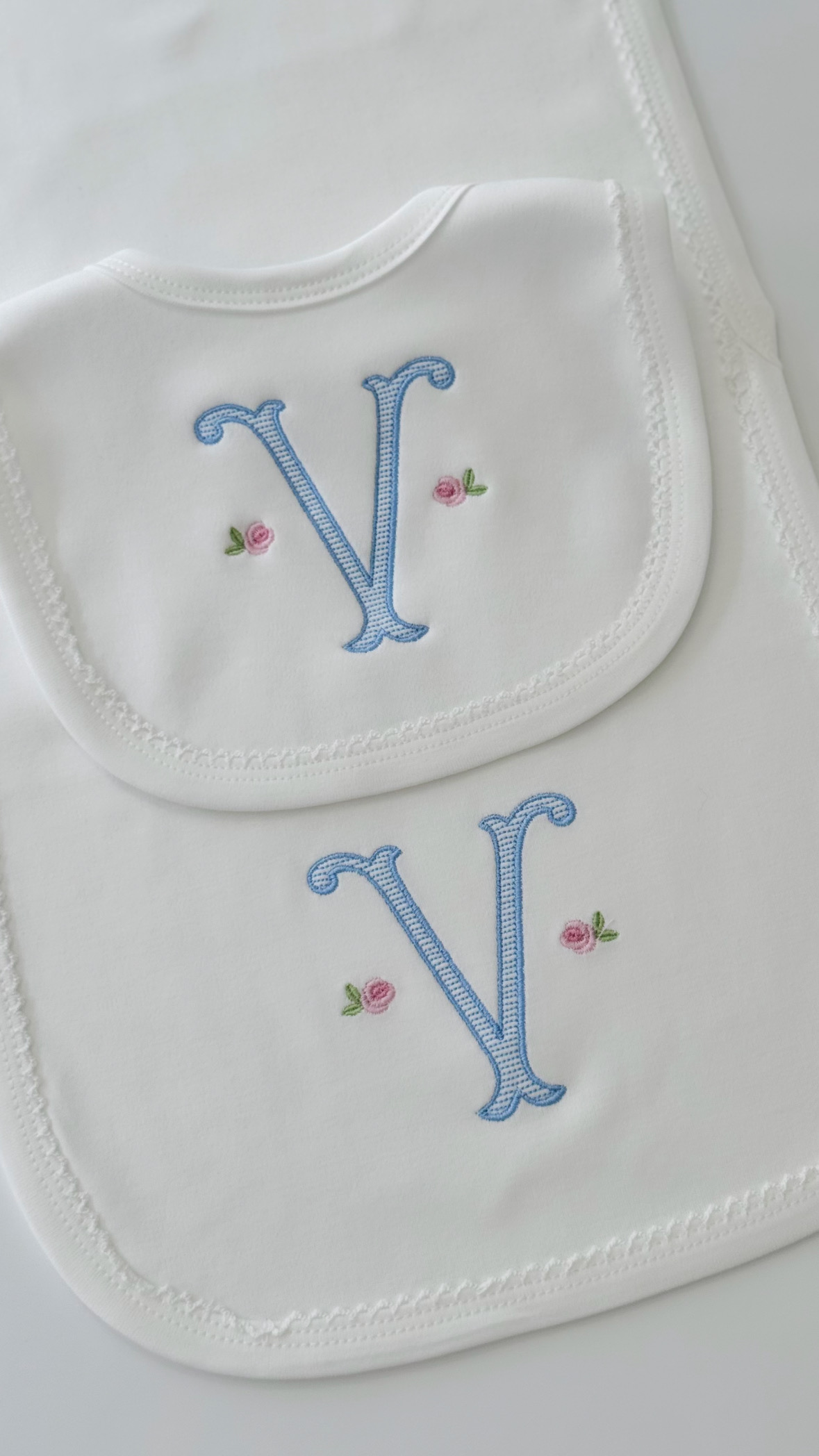 100% Cotton Organic White Picot Trim Bib and Burp Cloth Set. Monogram: V